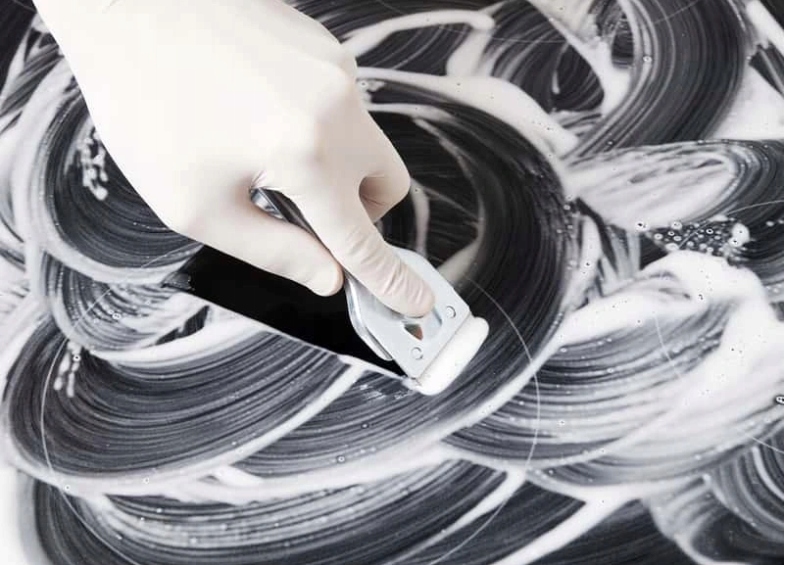 Удалите грязь и пригары скребком, желательно под углом 45 градусов - таким образом вы тщательно избавитесь от въевшейся грязи и вы не повредите поверхность.