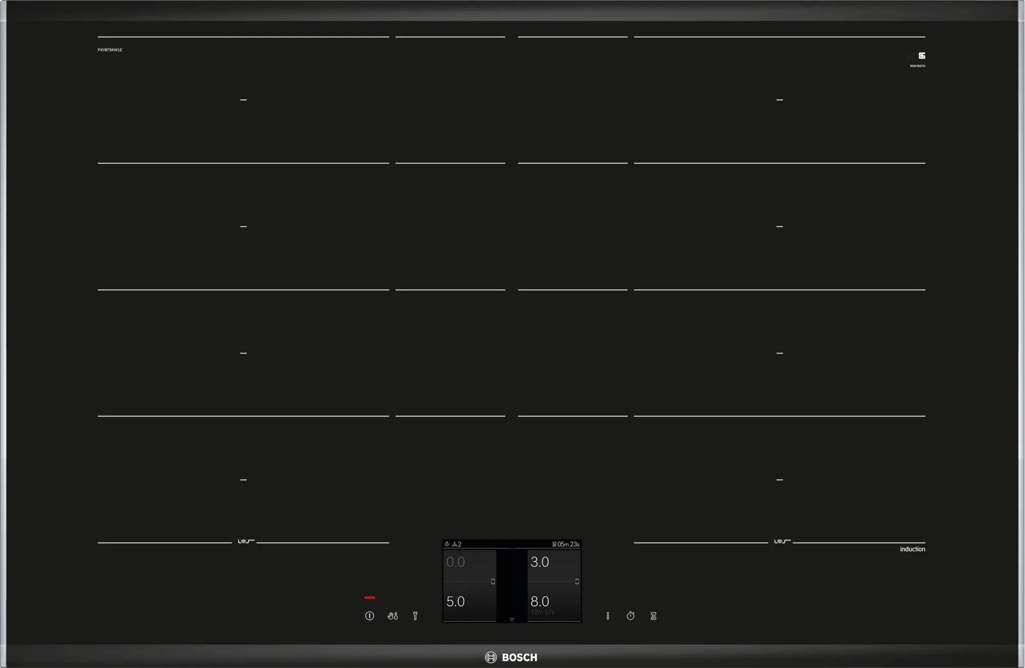 Индукционная варочная панель 81,6 х 52,7 см, с индикатором теплоотвода и 17 уровнями мощности. Индукционная варочная панель BOSCH PXY875KV1E с электронным управлением, имеет 4 варочные зоны, общая мощность 7400 Вт.