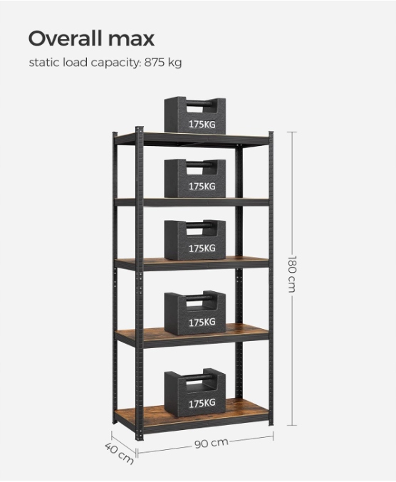 SONGMICS Отдельностоящая полка, книжный шкаф, полка для хранения, 5 полок, кухонная полка, полка, 40 х 90 х 180 см, грузоподъемность до 875 кг, регулируемые полки, промышленный дизайн, винтажный коричневый и черный GLR040B11