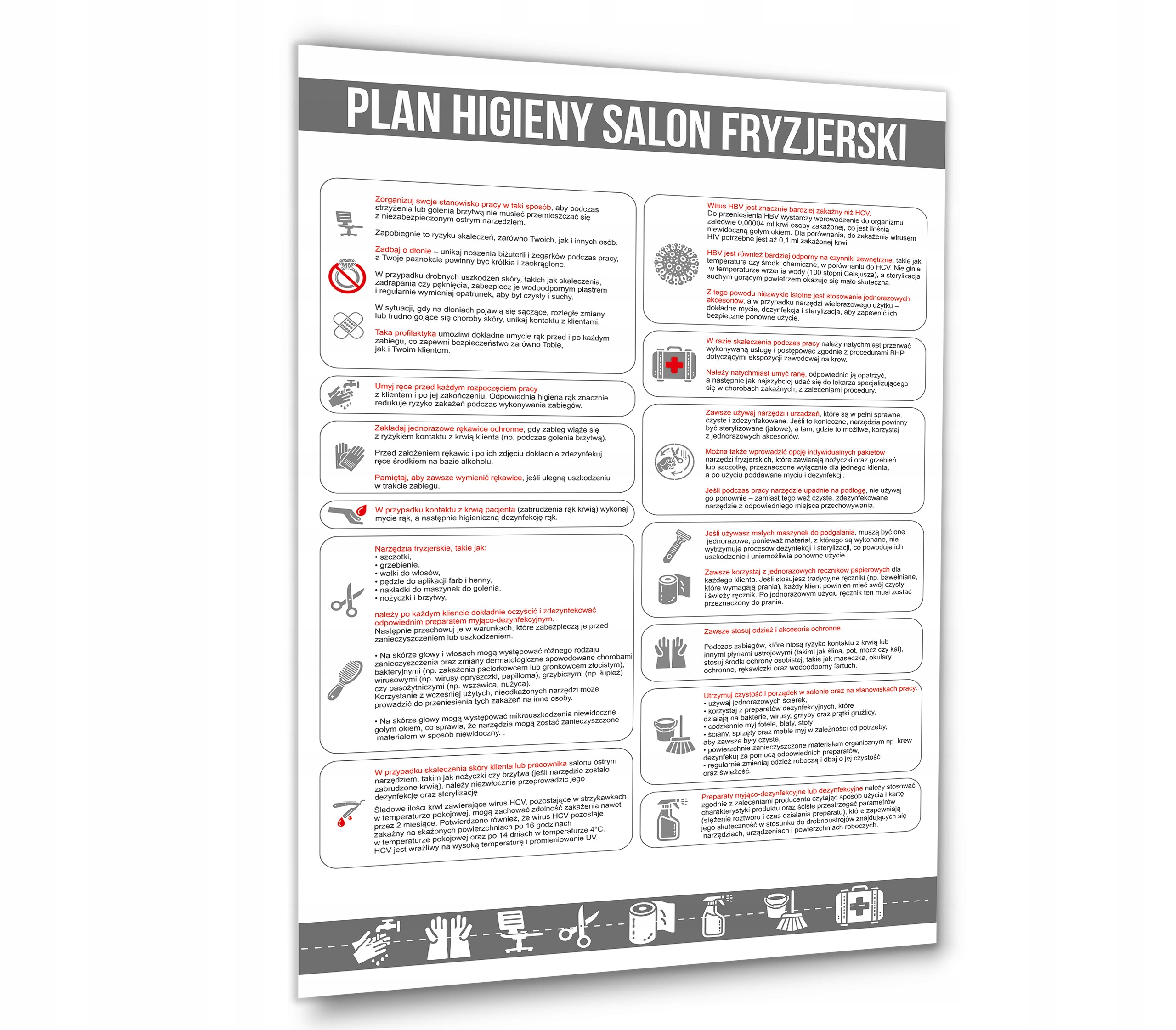 Продаваемый товар представляет собой профессиональную информационную доску «План гигиены парикмахерского салона», разработанную на основе проекта Министерства здравоохранения. Это обязательный элемент оборудования каждой парикмахерской, вытекающий из санитарно-эпидемиологических правил, направленный на обеспечение гигиены и безопасности как клиентов, так и персонала. В соответствии с Постановлением Министра здравоохранения от 17 февраля 2004 года о подробных санитарных требованиях к парикмахерским, салонам красоты и тату-салонам, каждый парикмахерский салон должен быть обозначен соответствующей табличкой с гигиеническим планом, регламентирующим правила чистоты и дезинфекции.