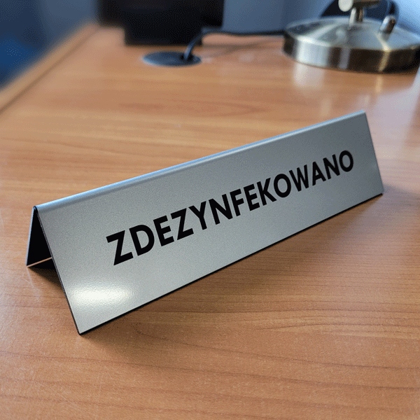 Настольная информационная табличка с гравировкой из гравировального ламината. Современный, элегантный стиль и точная лазерная гравировка. Табличка в форме перевернутой буквы V.