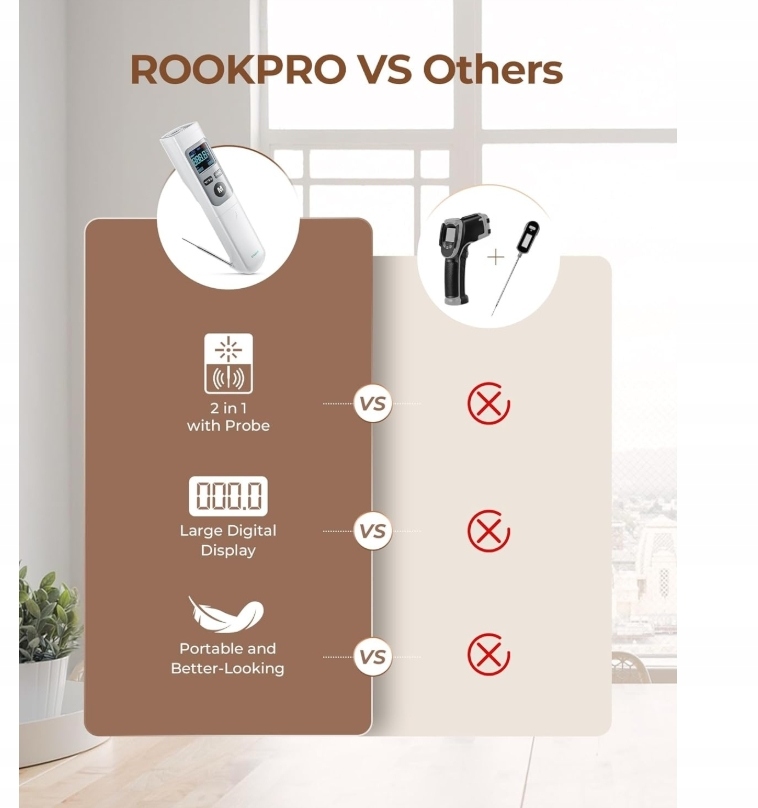 b ezconne и инновационный дизайн, который является улучшением цифровых термометров для пистолетов для мяса и температуры. Он может измерить как внутреннюю, так и температуру поверхности. Его можно использовать в качестве поверхностного термометра для сковороды с ИК -датчиком и термометром для пищи для пищи с термометром мяса.