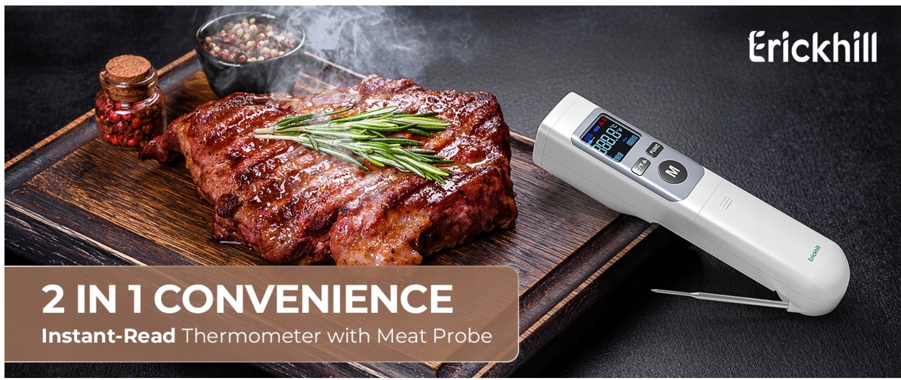 t Мясовый эрмометр оснащен зондом из нержавеющей стали, разрешенным контакт с пищей, и является идеальным инструментом для приготовления мяса, выпечки, сладостей, гриля на жидкости и многого другого. Этот термометр для поверхности гриля также имеет инфракрасную функцию, которая позволяет вам обнаружить температуру масла, печь для пиццы или гриль, чтобы помочь вам получить идеальную температуру приготовления.