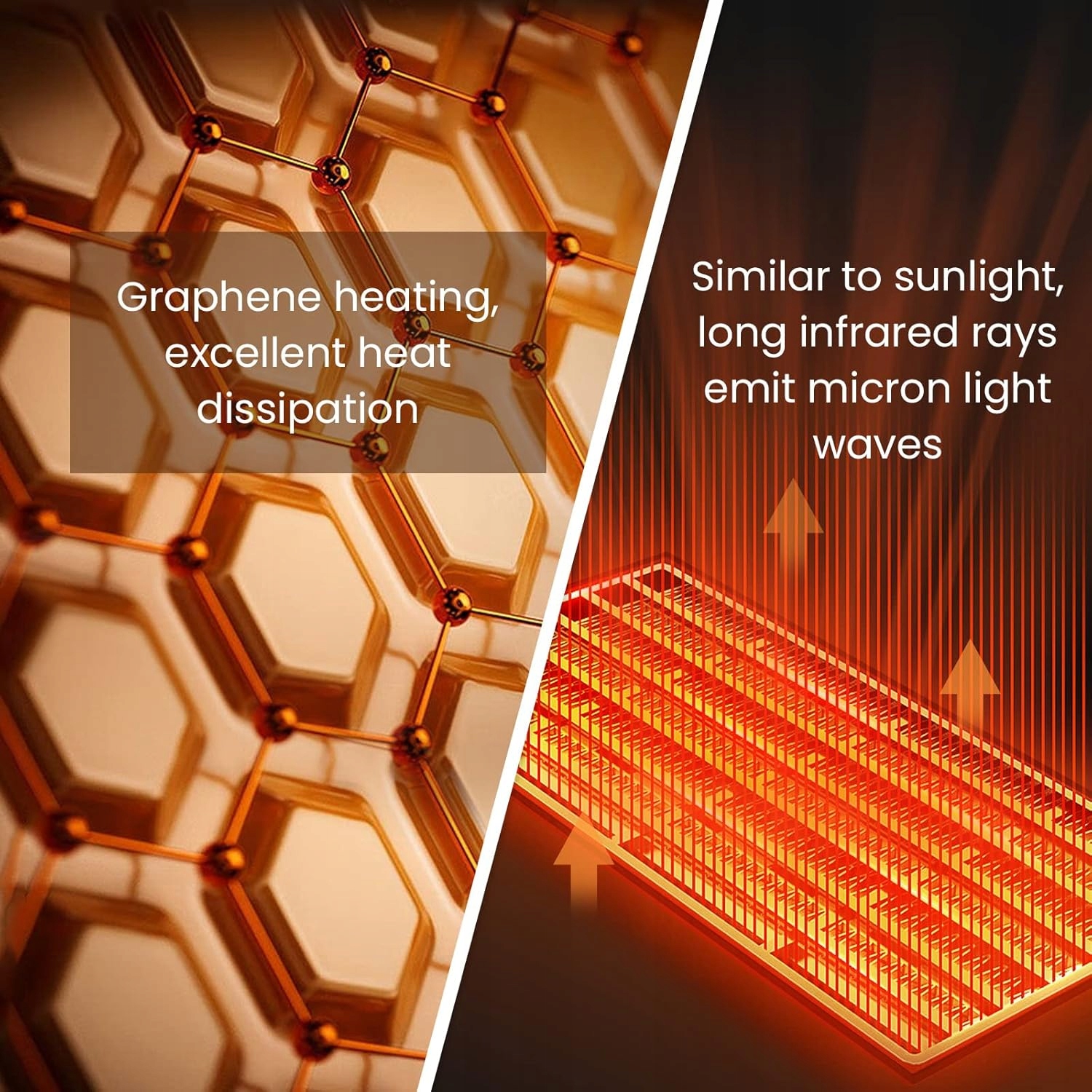 Суперэкономия энергии — инфракрасное отопление Hocosyme использует технологию «Graphene Electric Heating», позволяющую значительно снизить потребление энергии. Это не только снижает энергопотребление, но и улучшает преобразование тепловой энергии. При очень низкой мощности вы можете получить достаточно тепла.