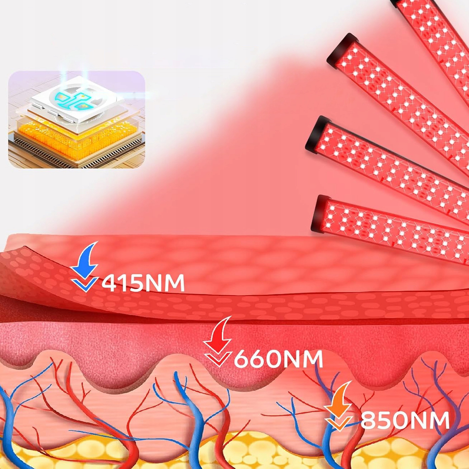 - equipped with chips with a wavelength of 660 Nm, 850 Nm and 415 Nm, provides comprehensive covering and increased efficiency.
