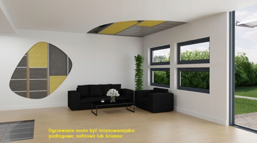 Нагревательная пленка укладывается под гипсокартон в системе сухого строительства. Система отопления позволяет создавать настенные радиаторы или большие поверхности нагрева, работающие при низких температурах. Температура в помещении и температура стены контролируются электронным термостатом