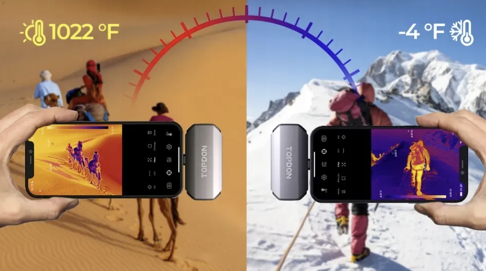 Технология улучшения изображения TOPDON делает поле зрения более четким и детальным за счет регулировки резкости и контрастности изображения. Функция поворота изображения позволяет пользователям просматривать температуру под разными углами, не поворачивая телефоны. Благодаря функции объединения изображений тепловизионная камера может объединять инфракрасное изображение с видимым изображением, снятым мобильной камерой