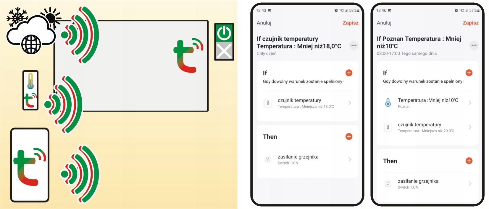 - возможность программирования настроек и сценариев включения и выключения отопления на основе информационного сигнала от отдельного WiFi датчика температуры и влажности - Tuya (приобретается отдельно)