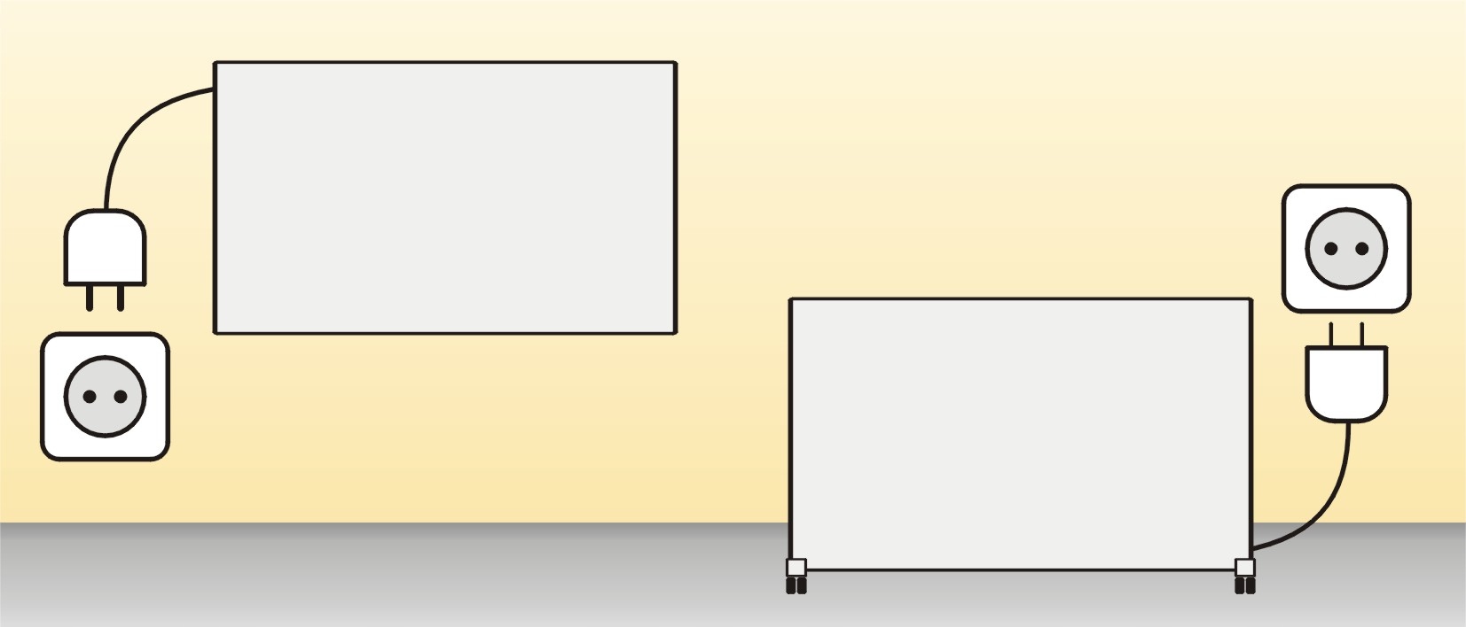 - любое рабочее положение: мобильное - стоящее (подставка с колесиками в комплекте) или настенное - подвесное (монтажный комплект в комплекте)