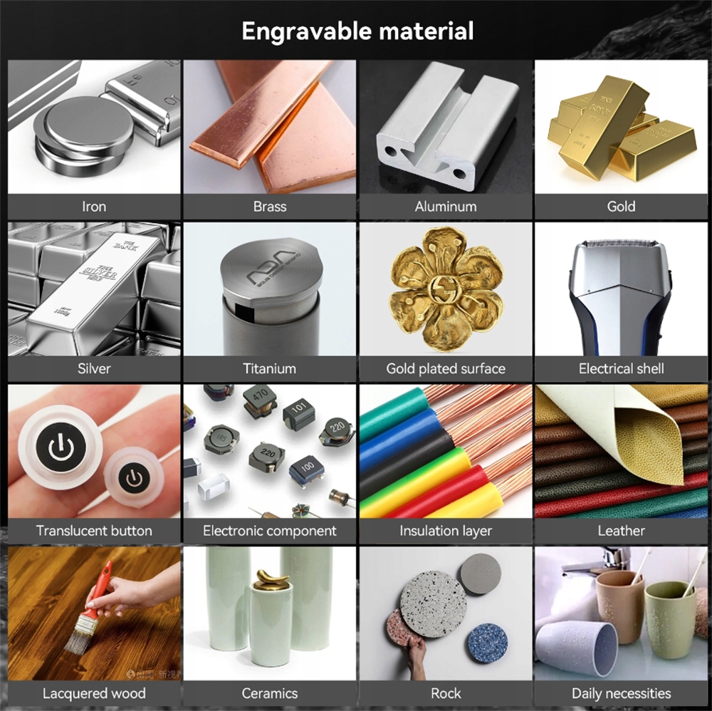 Металлы и сплавы (все металлы, такие как железо, медь, алюминий, магний, цинк, золото, серебро, титан и т. д.), оксиды металлов, гальванические поверхности, материалы ABS, чернила, эпоксидные смолы, кожа, дерево (окрашенное), керамика (окрашенное), камень и т. д.