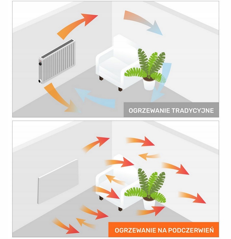 Инфракрасные обогреватели обеспечивают глубокое тепло посредством излучения. Испускаемые волны непосредственно нагревают людей и все окружающие их предметы. Предметы в радиусе действия радиатора поглощают тепло, а затем отправляют его обратно в помещение, создавая замкнутую циркуляцию тепла. Этот метод отопления намного эффективнее традиционных радиаторов, поскольку выделяемое тепло не уходит с воздухом.