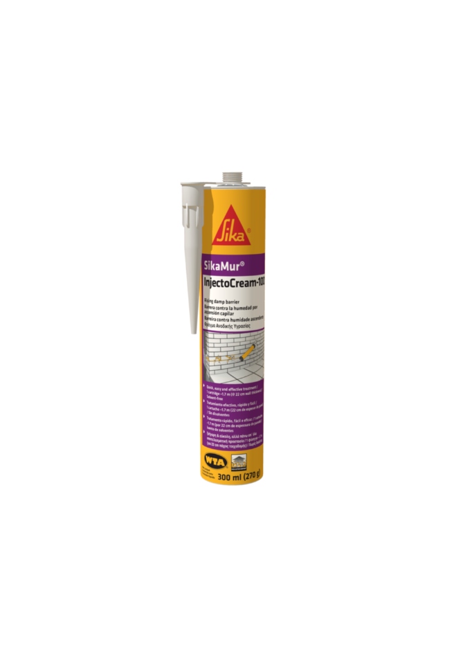 Sikamur® Injectocream-100-это материал, который является основой для новой концепции контроля капиллярной влаги. Sikamur® Injectocream-100-это гидрофобный крем, упакованный в 600-граммовые колбасы или 300 мл картуч. Он прижат обычным пистолетом для строительных воздушных змеев в несколько отверстий, просверленных в стене стены. Специализированное оборудование не требуется для инъекции. Sikamur® Injectocream-100, выдвинутый в сварные швы, он диффундирует в влажной стенке, создавая диафрагму, предотвращая подтягивания капиллярной воды. Sikamur® Injectocream-100 соответствует требованиям WTA 4-4-04/D «инъекции стены, чтобы избежать вытягивания капиллярной влаги».