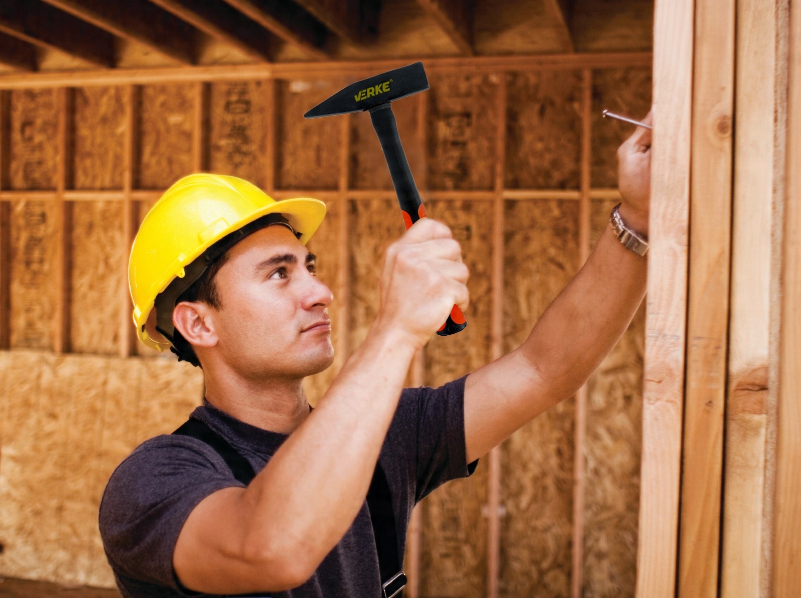 Стальной молоток, закрепленный на рукоятке из устойчивого к повреждениям материала на основе стекловолокна. Поверхность молотка почернела.