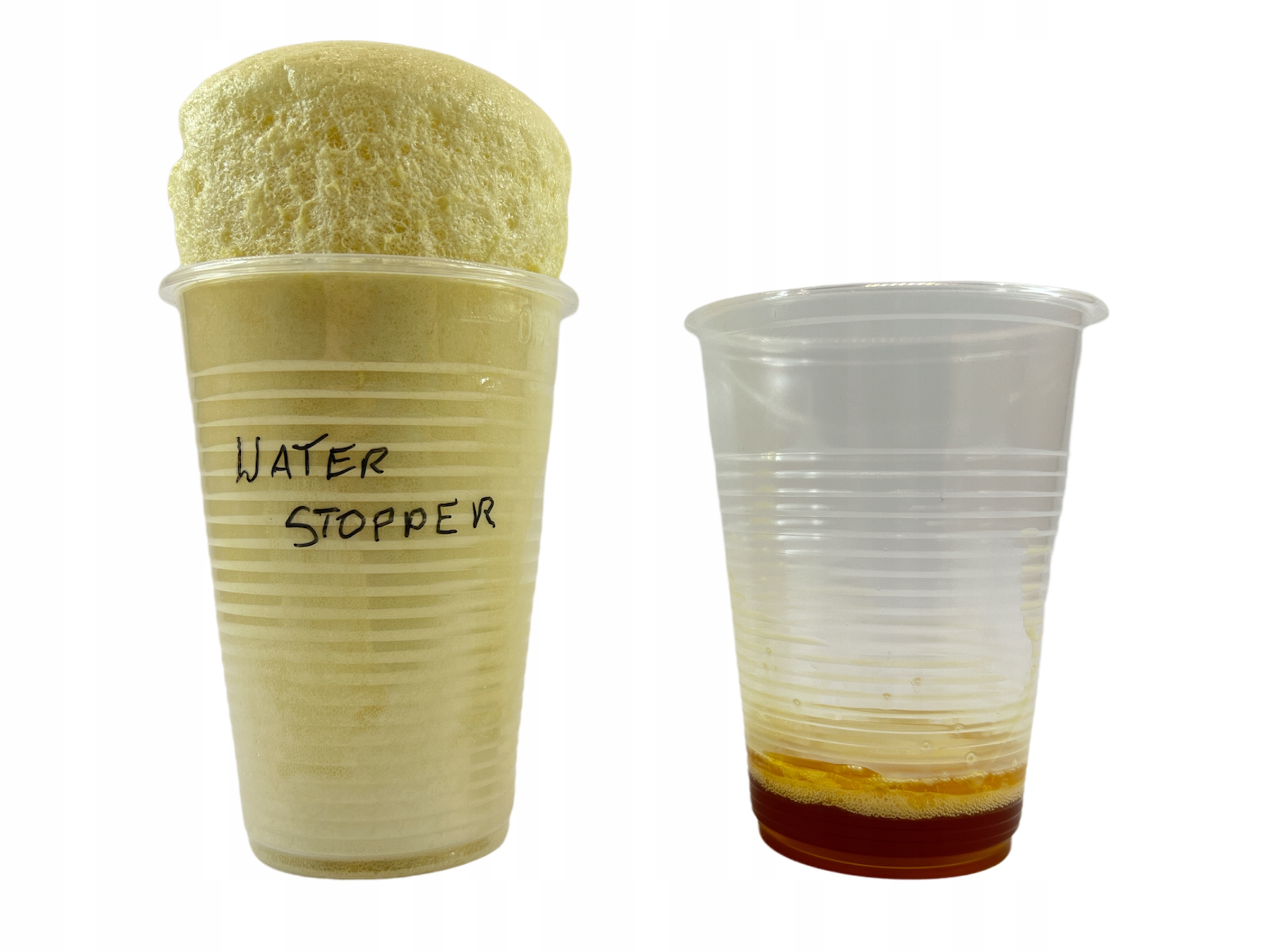- образец слева: после контакта с водой (через 3 минуты – полужесткая пена)