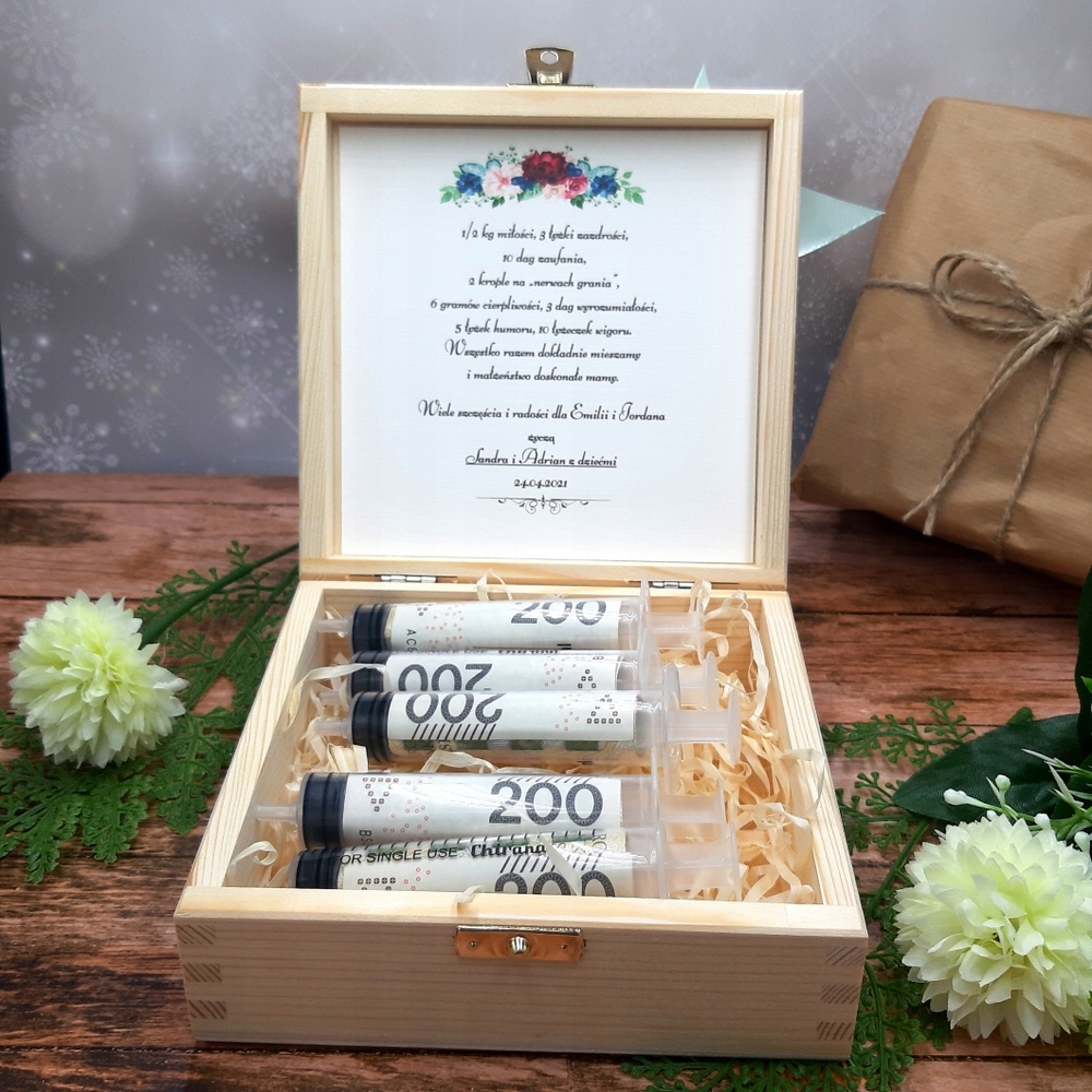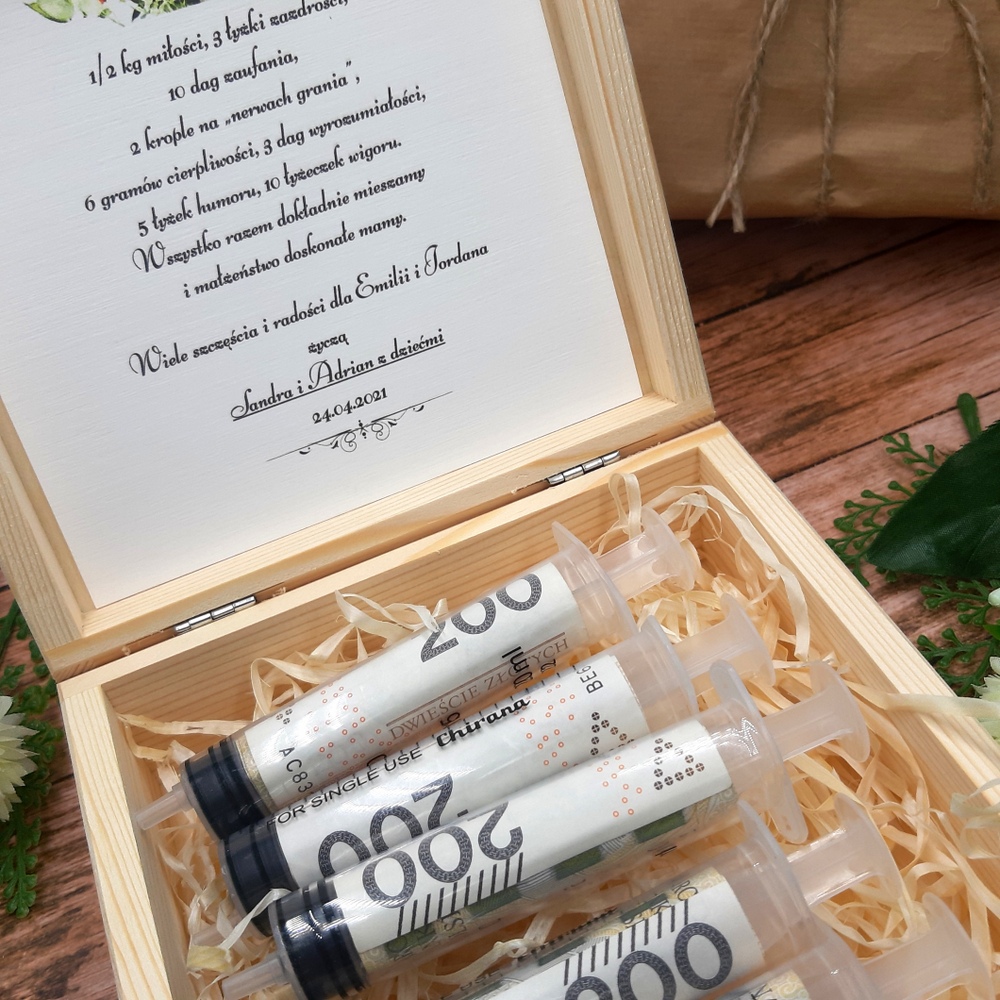 Ящик из светлого соснового дерева с 5 шприцами, в которые закатываем и кладем определенное количество. Внутри пожелания - 41 стихотворение на выбор.