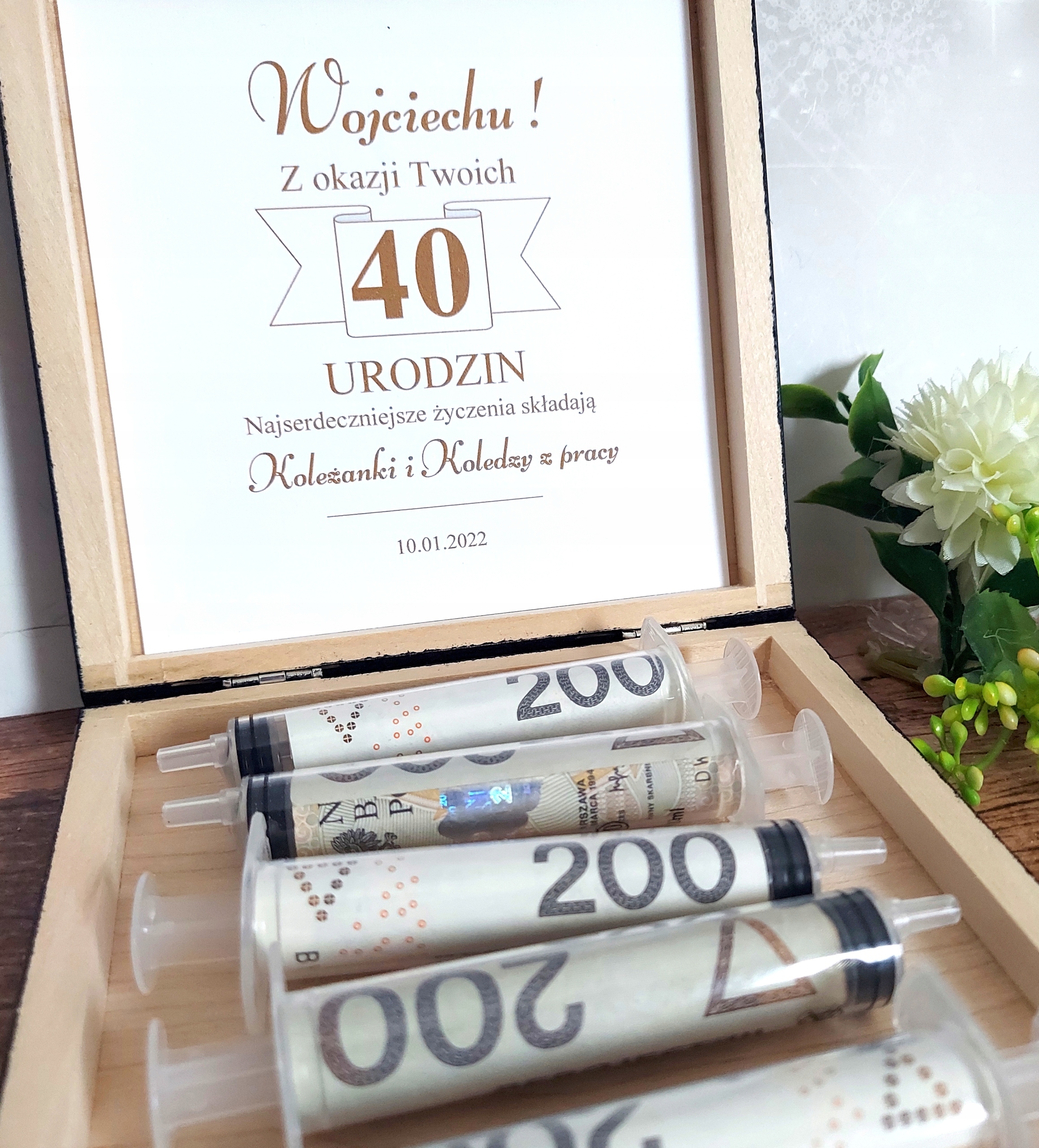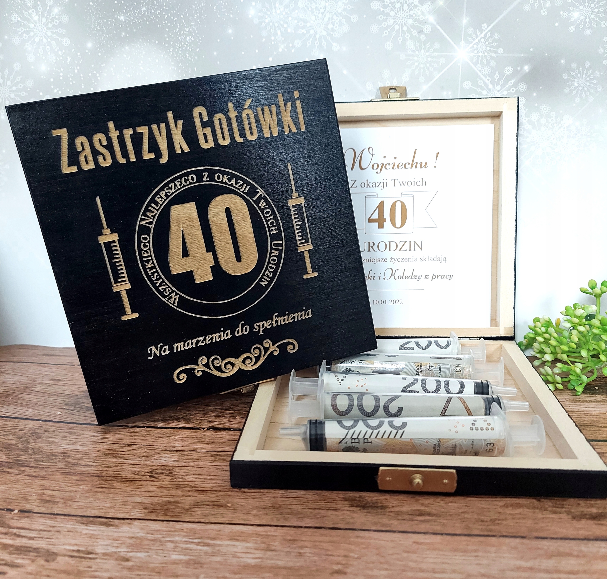 Деревянный сосновый ящик с 5 шприцами, в который закатываем и кладем определенное количество. Прекрасный подарок имениннику на 40-летие.