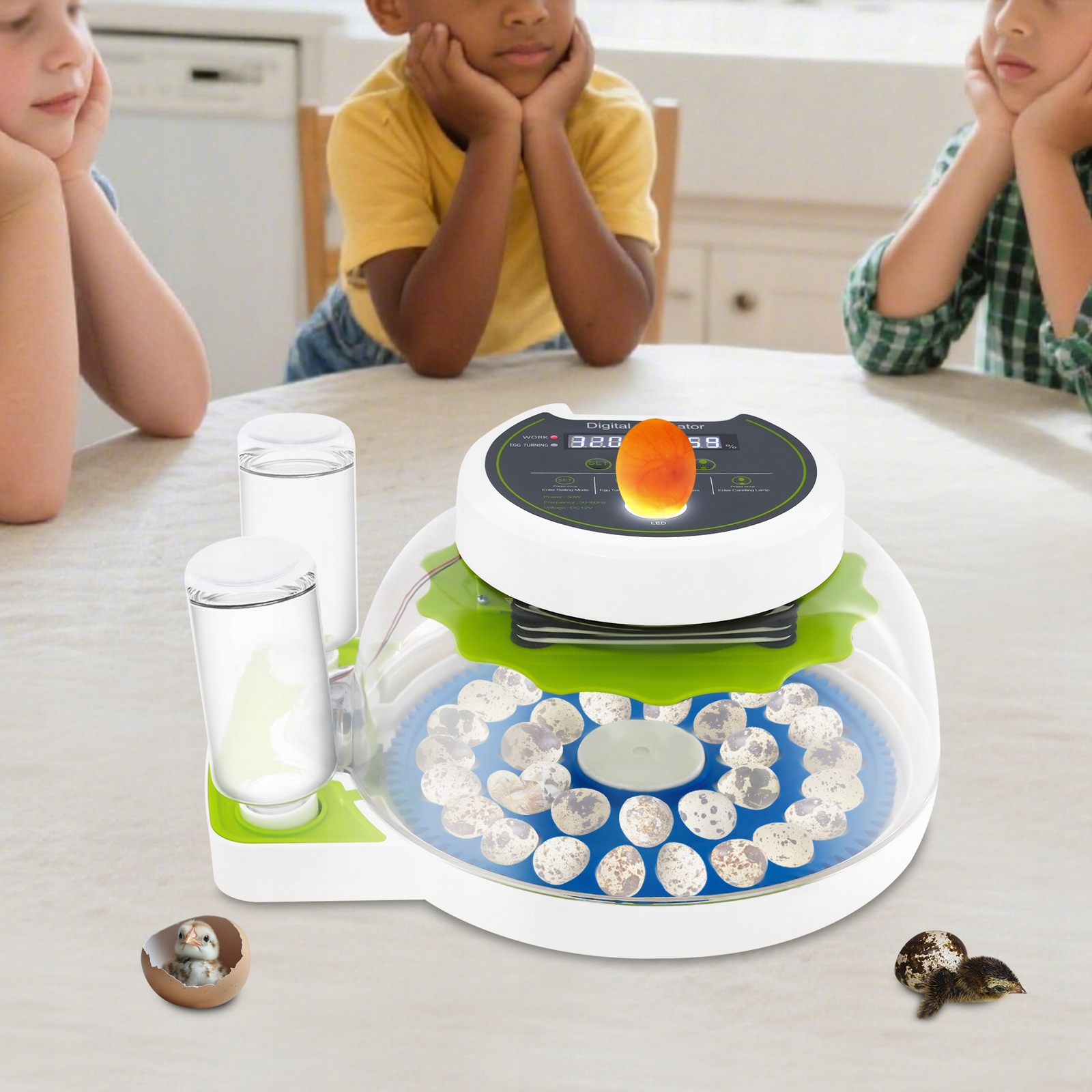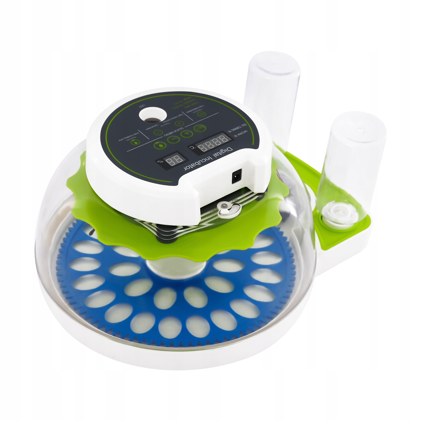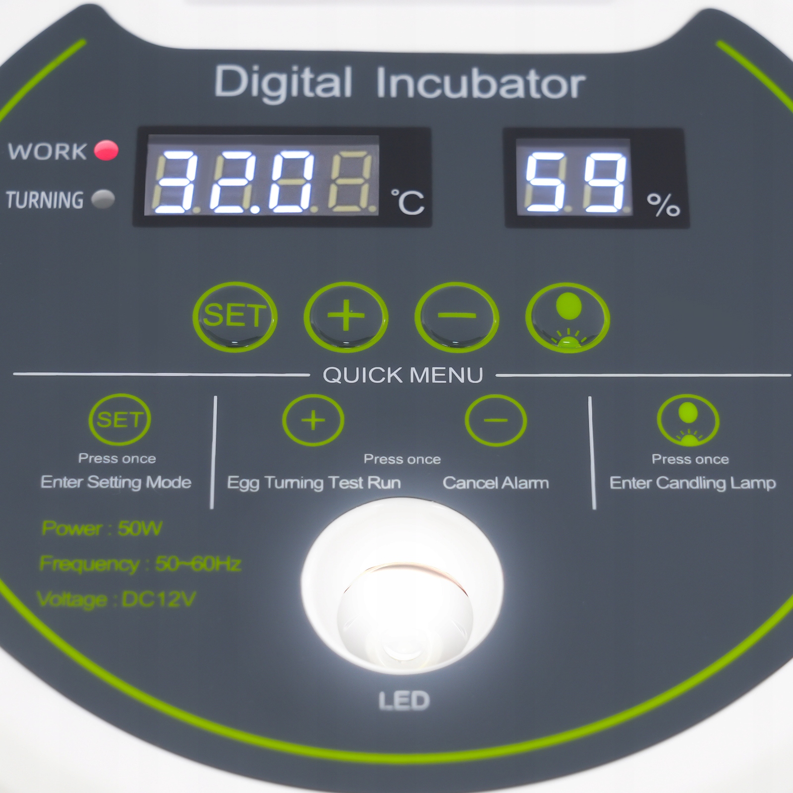 - Удобная конструкция:Круглый вращающийся лоток для яиц, приводимый в движение двигателем, который автоматически вращается каждые 2 часа, исключает необходимость переворачивания яиц вручную. Вы можете регулировать температуру и влажность, нажимая кнопки на панели управления.
