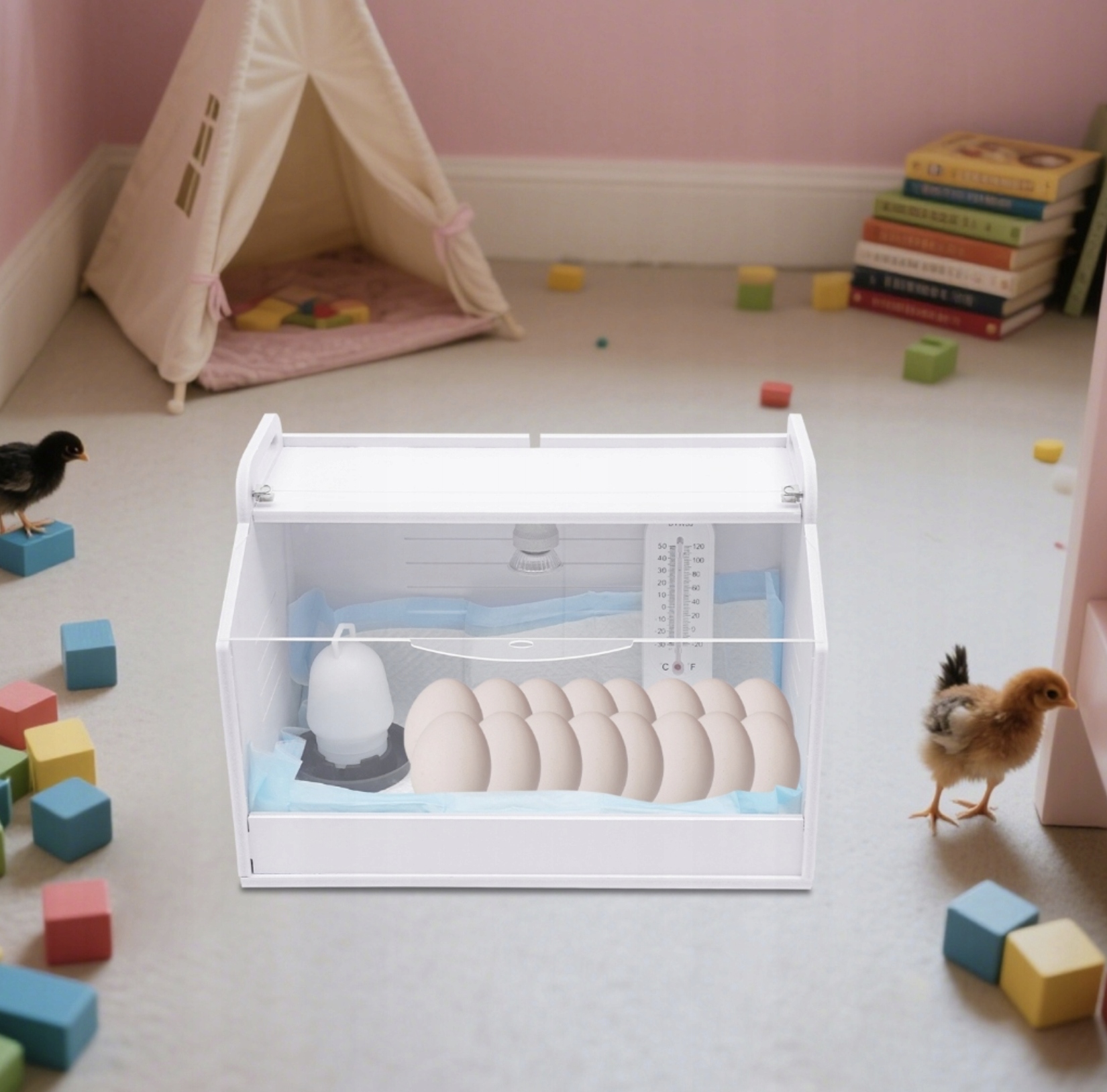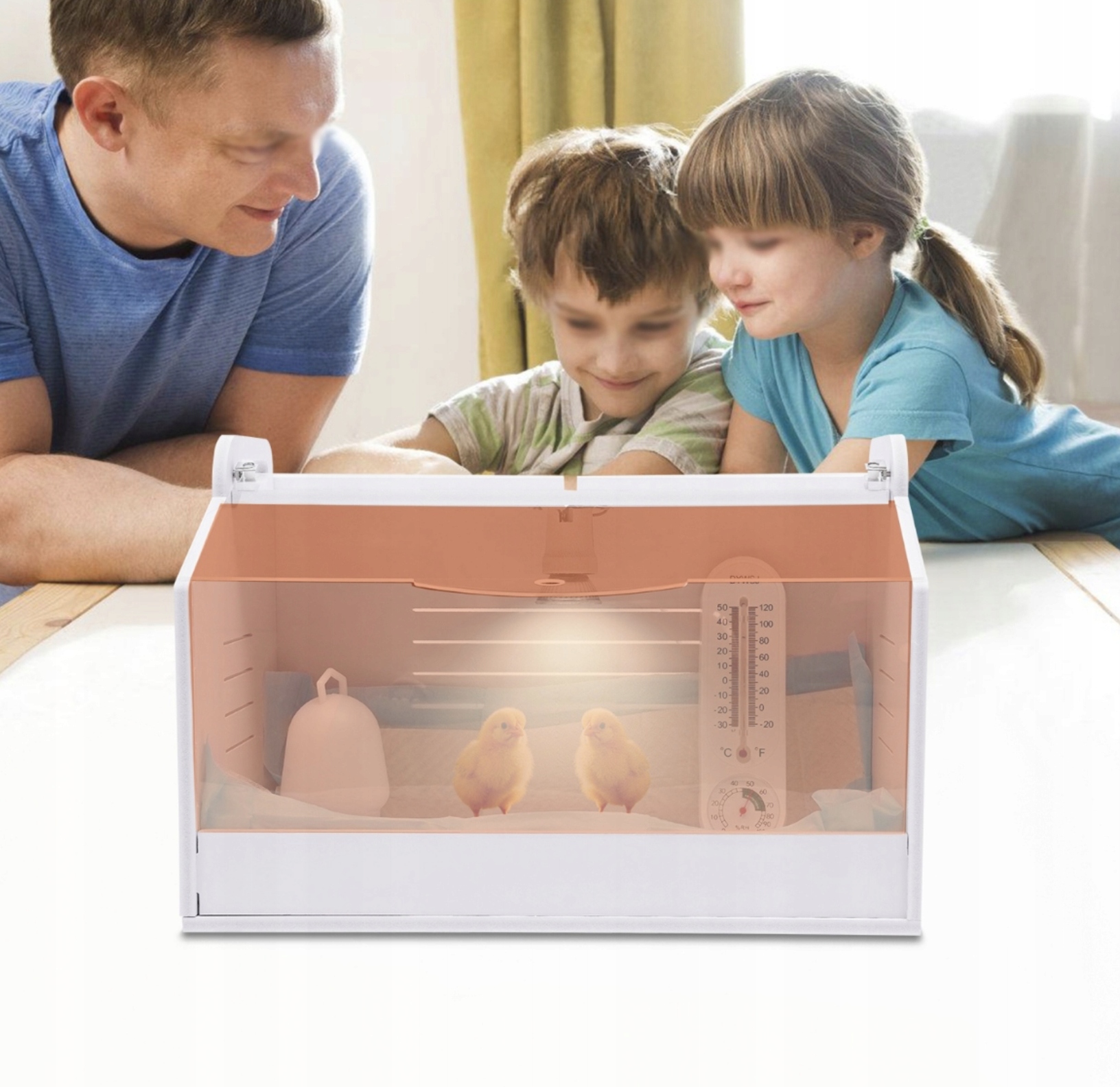 - Регулируемая нагревательная лампа: Входящая в комплект «солнечная лампа» с плавной регулировкой яркости позволяет точно регулировать температуру внутри, обеспечивая детенышам идеальное тепло для правильного развития.