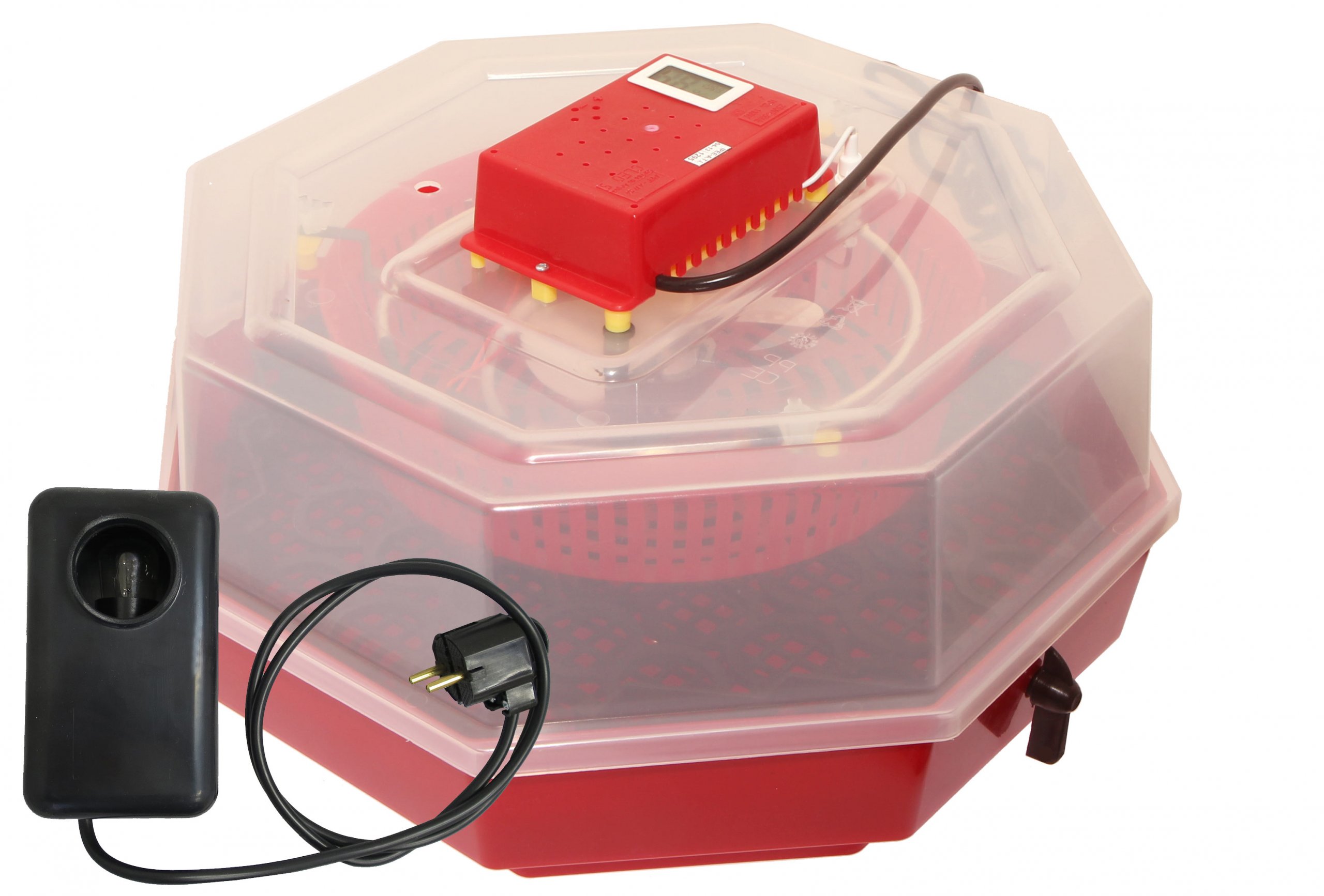 Кроме того, инкубатор оснащен полуавтоматическим лотком для колебательного вращения яиц. Полуавтоматическое вращение означает, что все яйца в инкубаторе мы переворачиваем одной рукой. (на других наших аукционах вы можете найти модель с автоматическим двигателем поворота яиц).