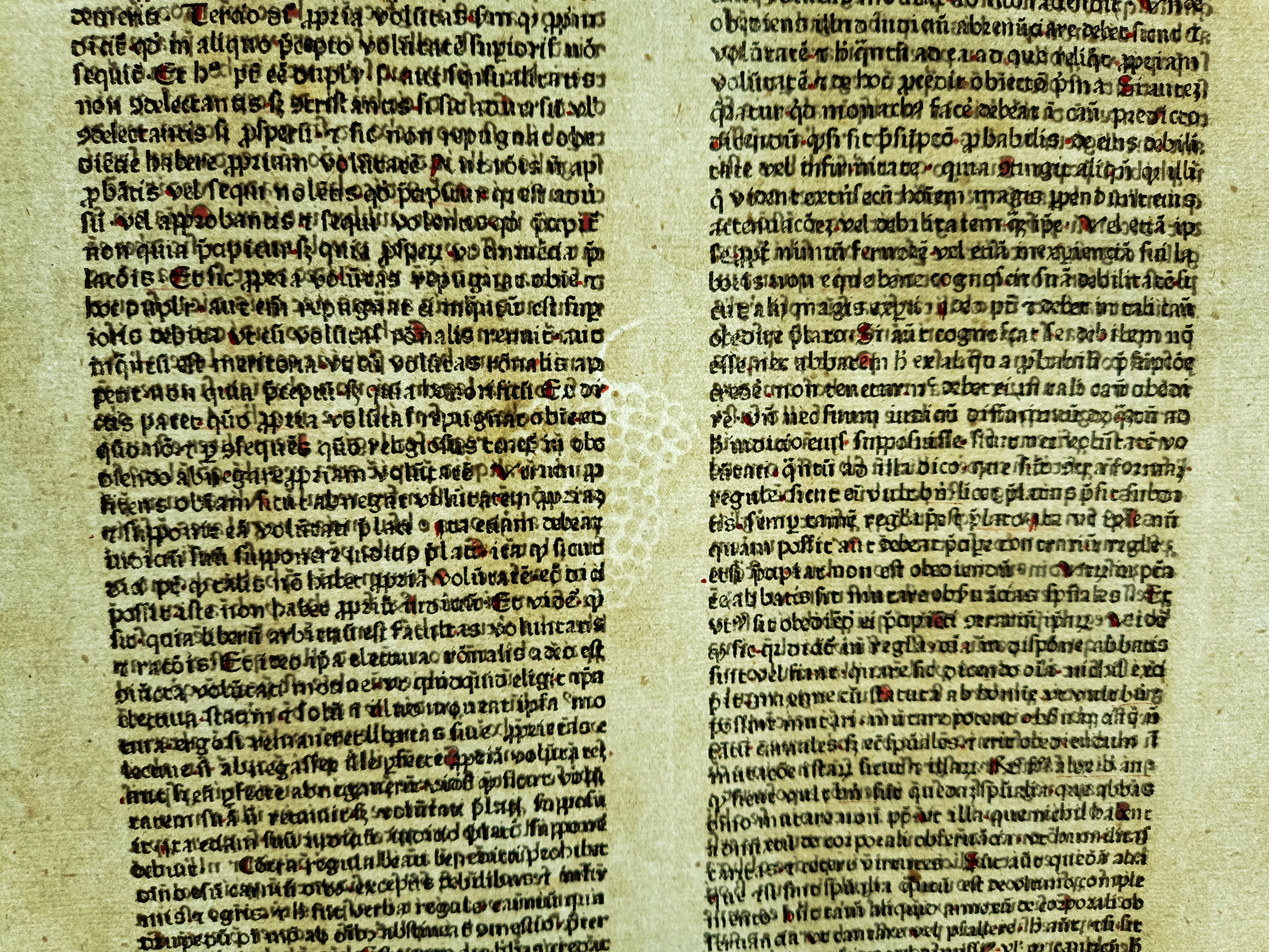 Карточка - большой фолиант (ок. 28 х 40 см) - из инкунабулума до 1480 г. (на этот период указывает отсутствие нумерации, заголовка, хранителей и т. д. - вероятно, это отпечаток примерно 1470 г.). Печать раскрашена вручную, вверху страницы — номера глав и карточек, нарисованные вручную. Красивый крупный водяной знак - большая гроздь винограда.