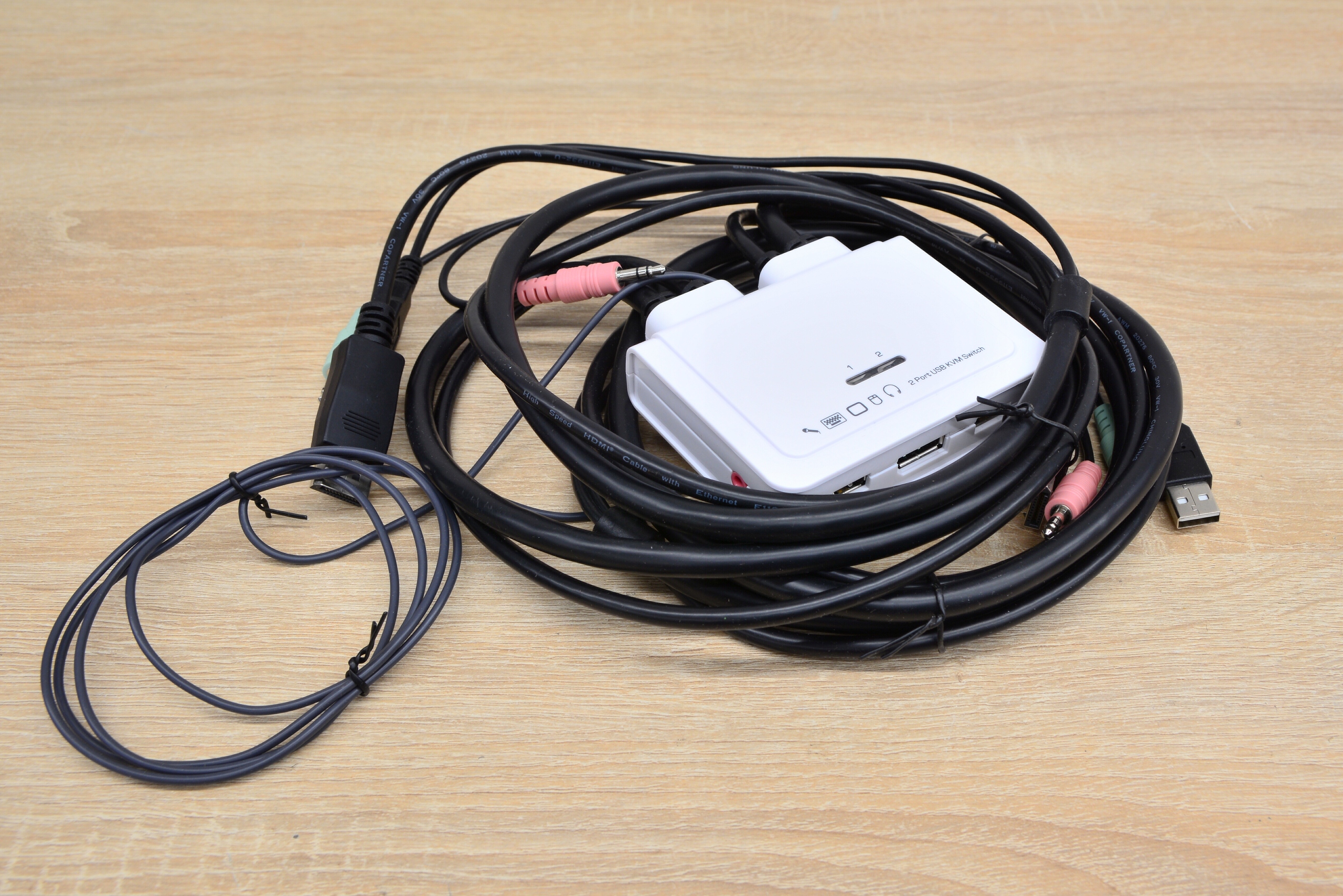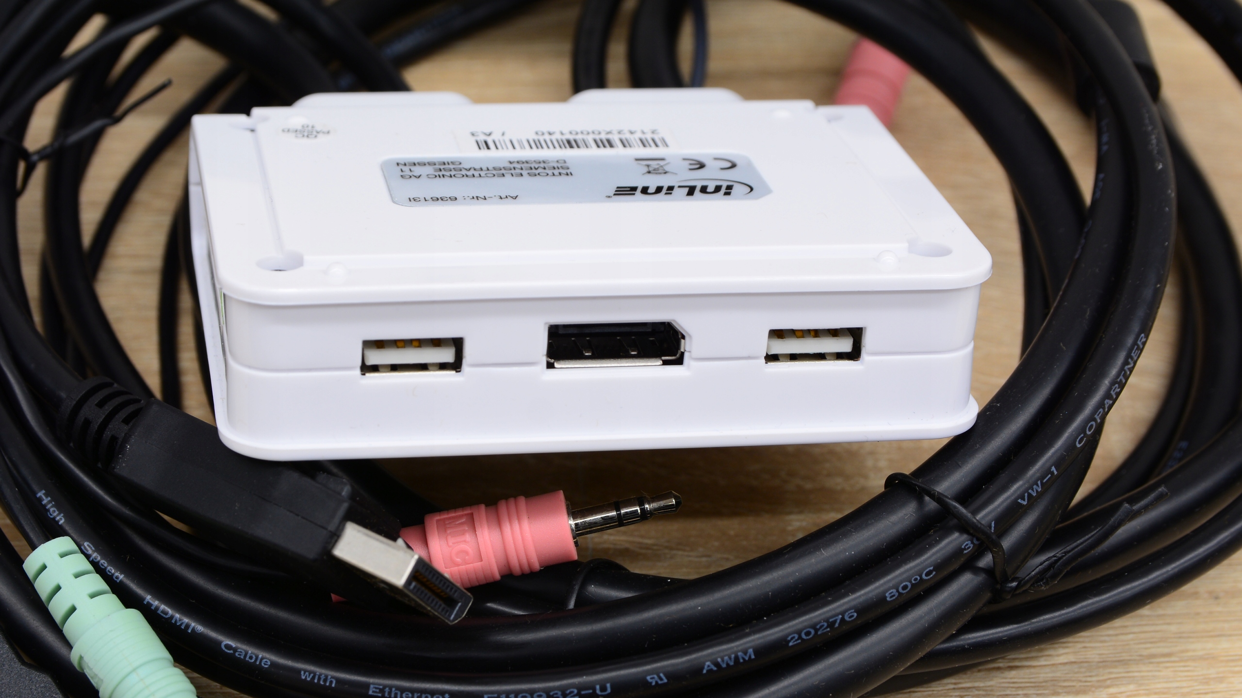 - Переключатель с 1 разъемом DisplayPort, 2 разъемами USB 2.0, 2 аудиоразъемами 3,5 мм.