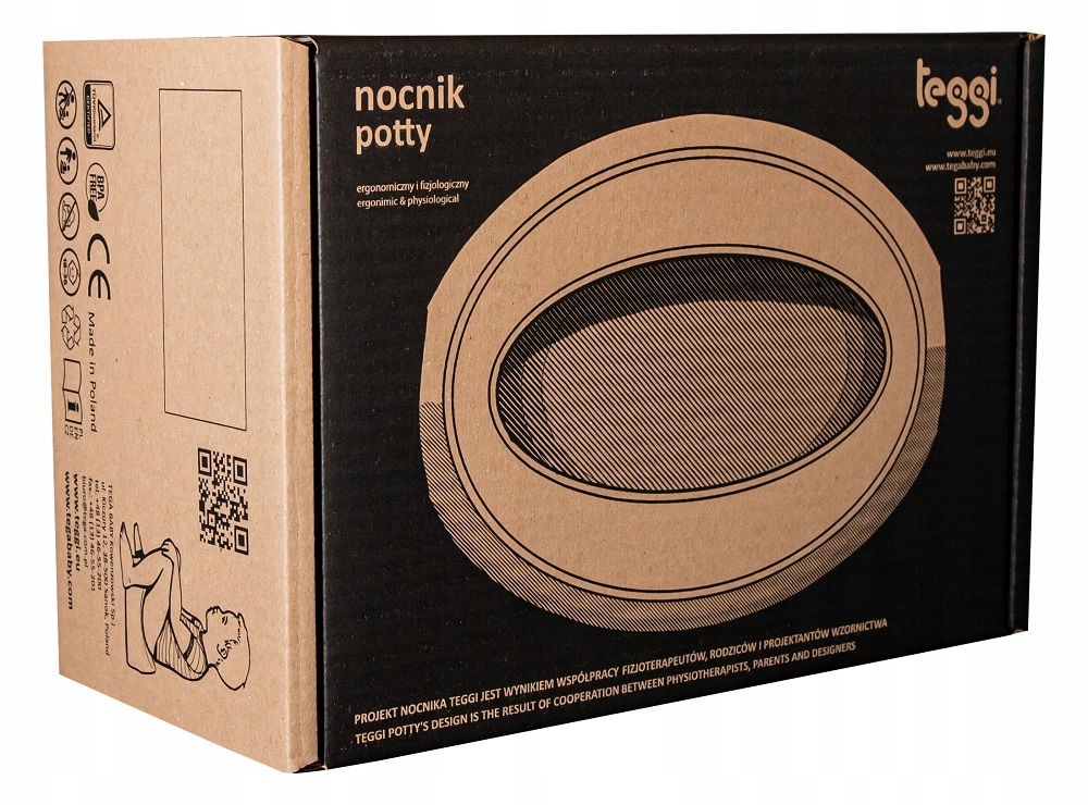 Специально разработанная симметричная и эргономичная форма горшка Teggi является результатом сотрудничества физиотерапевтов и родителей и дизайнеры . Его анатомическая форма и размер идеально адаптированы к строению тела ребенка. Благодаря высоте сиденья детям легче садиться и вставать с горшка. Съемная внутренняя часть горшка облегчает чистку. Нижний край имеет противоскользящее покрытие, что обеспечивает устойчивость горшка на полу.