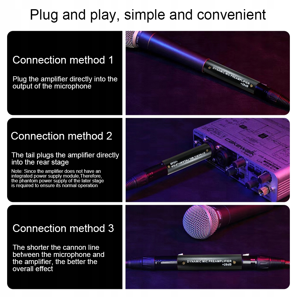 4. 【Легко в использовании подключения XLR】: предусилитель имеет интерфейс соединения XLR, обеспечивая надежное и безопасное соединение для динамического микрофона. Просто подключитесь и играйте, без необходимости сложной конфигурации или дополнительного источника питания. Удобно поддерживает энергоснабжение Phantom 48 В для повышения эффективности.