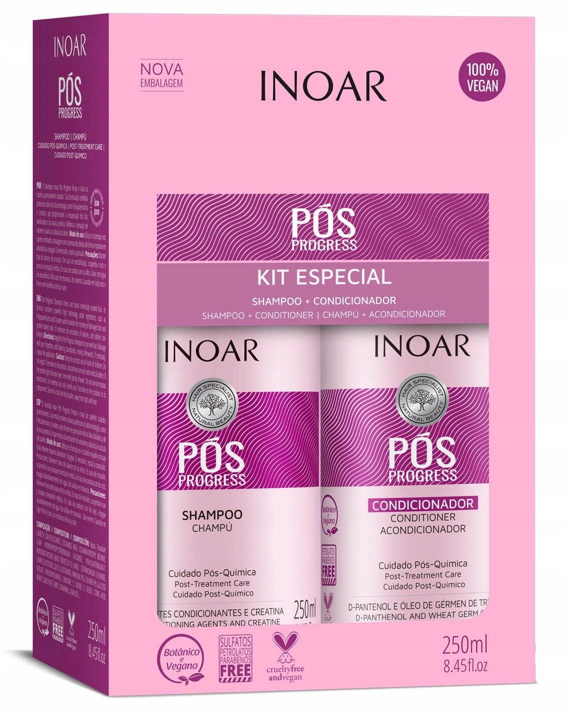 Набор INOAR POS Progress DUO PACK — косметика, предназначенная для ухода за волосами после кератинового выпрямления. Они постоянно восполняют дефицит кератина и продлевают эффект разглаживания. Кроме того, в составе содержится ценный Д-Пантенол, который защищает волосы от сечения и делает их мягкими и красивыми.