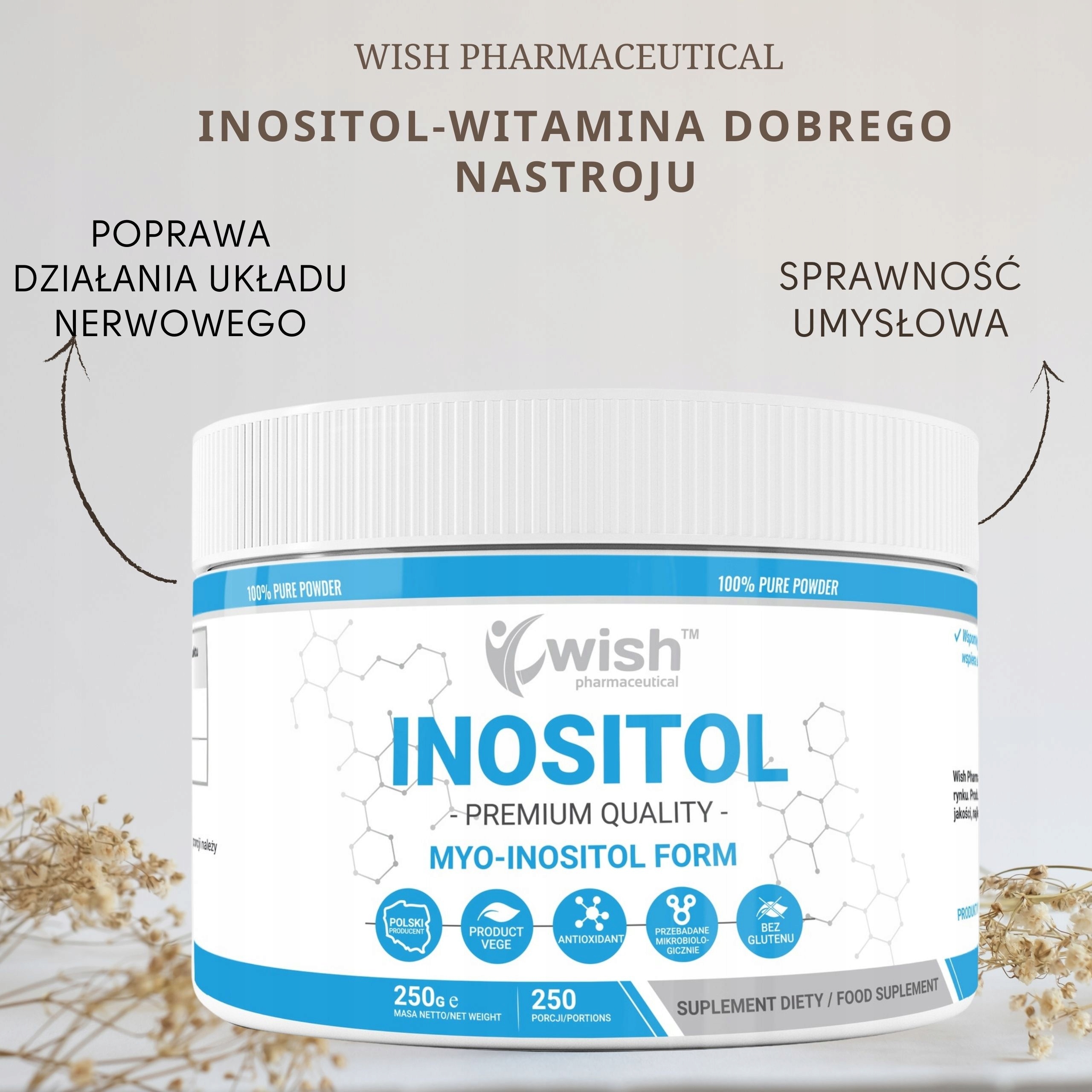 Инозитолтакже называемый витамином B8 реагирует на в организме человека, среди прочего для правильного функционирования нейромедиаторов. Повышает чувствительность рецепторов к серотонину, что приводит к улучшению самочувствия, умственной работоспособности и стабилизации настроения. Инозитол синтезируется в организме человека и поступает с пищей. Его дефицит возникает в результате повышенного стресса и, прежде всего, вымывания его из организма чрезмерным количеством жидкости, такой как кофе и чай.