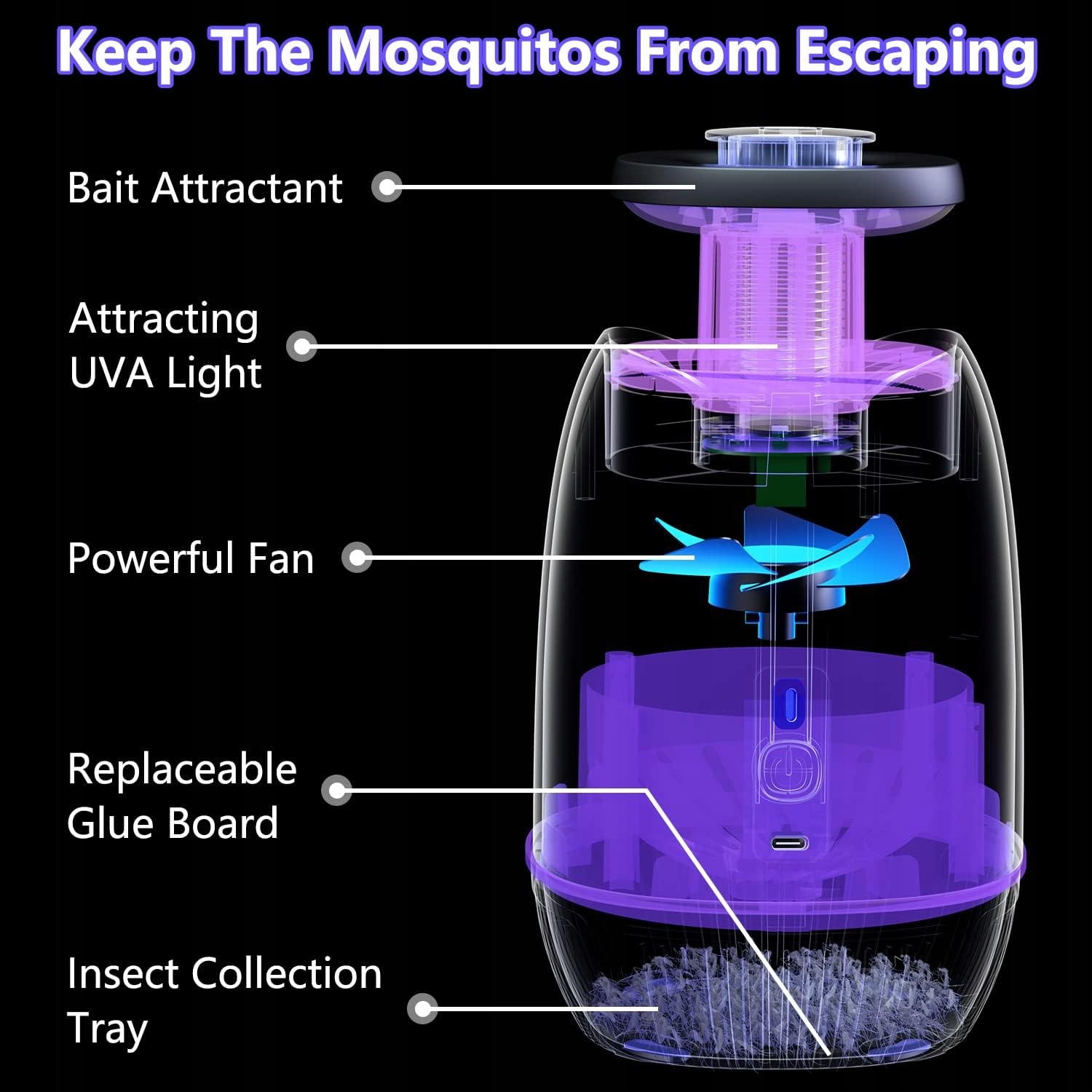 【ВНУТРЕННЯЯ КРЫШКА】Устройство для ловли комаров для использования в помещении , имеет тройную силу улавливания: УФ-свет, мощный вентилятор и дополнительно оснащен 5 сменными клейкими пластинами, которые в сочетании с устройством повышают эффективность отпугивания комаров, плодовых мух, комаров, клопов и насекомых, летающих в закрытом помещении. (Используйте ловушку для плодовых мух в помещении, рядом с фруктами, растениями, зараженными насекомыми, или мусорными баками.)