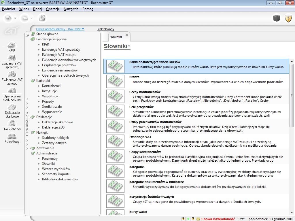 GT Rachmist является частью линии INSERT GT, которая также содержит систему GT Subeta - Seals Service для малого и среднего бизнеса, Rewizora GT - Программа для сохранения коммерческой книги, GT Gratifikanta GT - HR и System Payroll System и Gestor GT - REGINEPRENTION RECIGING Returnings System. Двигатель базы данных, используемый во вставке GT для программ Microsoft SQL Server, которые в бесплатной версии Express Edition поставляется с системой.