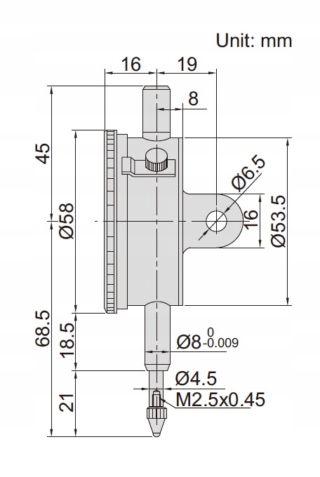 Стрелочный измерительный датчик с диапазоном измерения 0-10 мм и шкалой 0,01 мм. Датчик имеет метки допуска и стопорный винт.