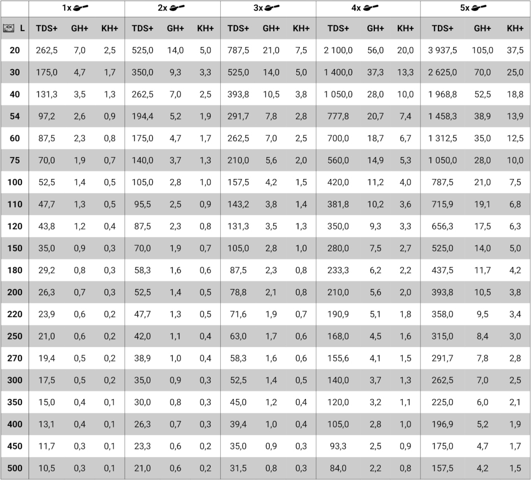 Отрегулируйте количество плоских мер (5,5 г) к параметрам, которые вы хотите достичь, и размер аквариума (см. Таблицу ниже). Можно дозироваться непосредственно к аквариуму, но мы рекомендуем расторгнуть дозу препарата в 1 литр воды и распространять его по аквариуму. Краткосрочная турбулентность воды исчезнет естественным путем в течение нескольких минут. Храните в плотно закрытой упаковке в сухом и темном месте.