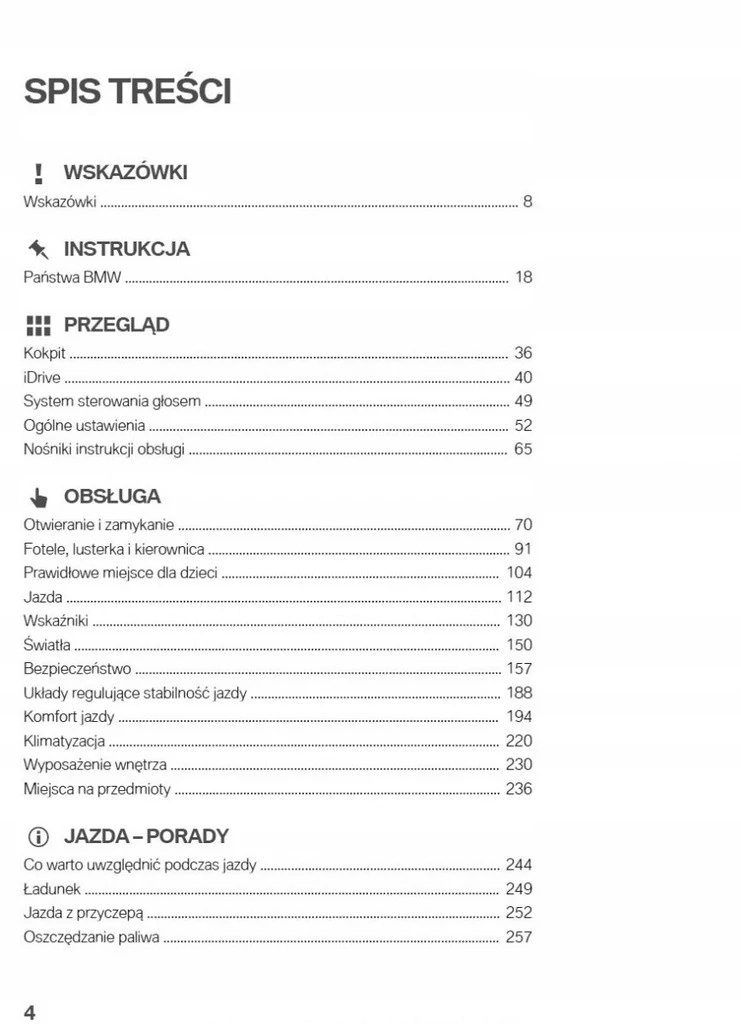 Руководство по эксплуатации BMW содержит все варианты оснащения и полезную информацию о том, как эффективно и безопасно использовать автомобиль, например: - указатели поворота, контрольные лампы, открывание и закрывание - освещение и обзорность, сиденья, отсеки для хранения вещей, отопление, вентиляция, кондиционер. - советы по вождению, эксплуатации, обслуживанию автомобиля - уровни жидкостей, проверка и доливка, аварийные операции, замена колес, предохранителей, замена лампочек - технические данные... и многое другое, что дает путешественникам ощущение безопасности и комфорта.Польское законодательство обязывает продавца приложить к . Руководство пользователя автомобиля новое, на польском языке.