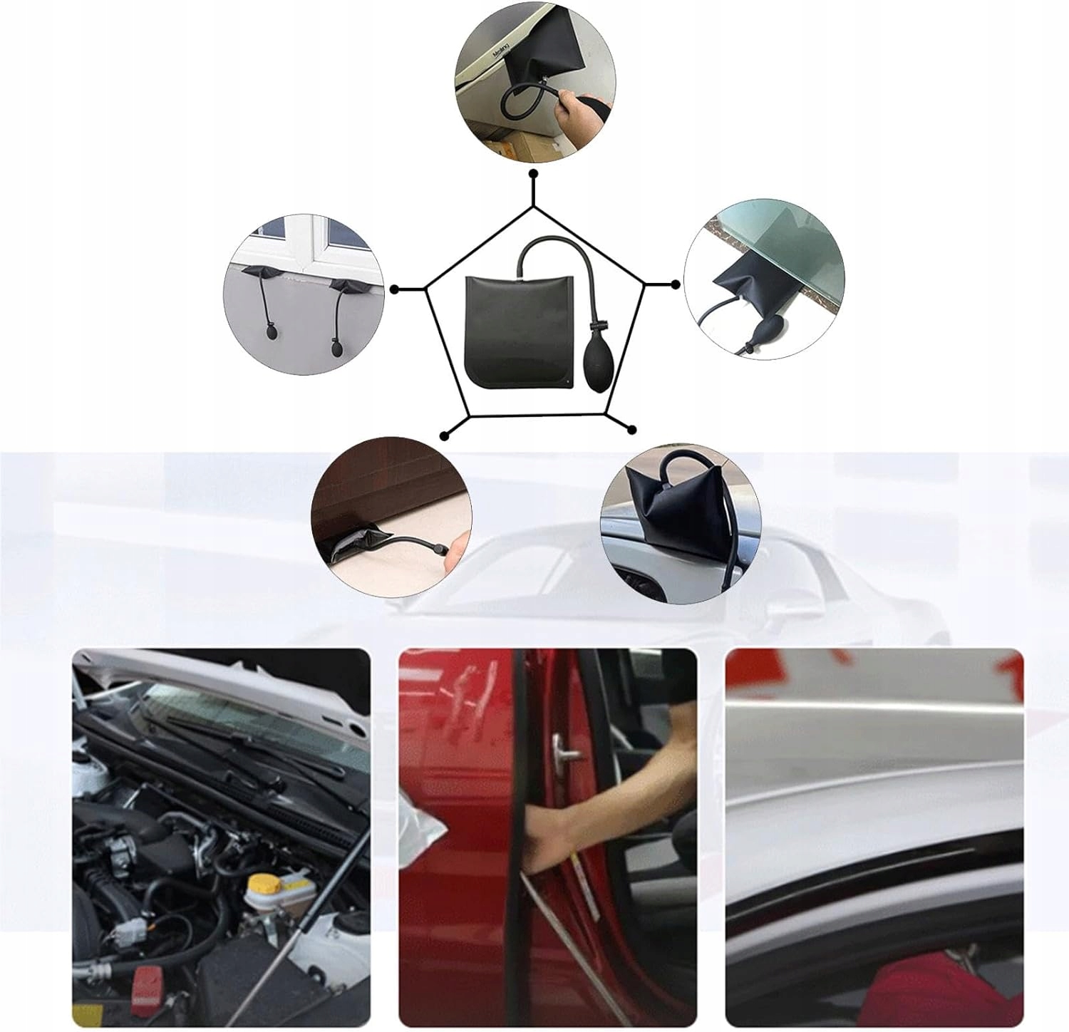 Набор инструментов изготовлен из прочного и безопасного двустороннего нейлонового материала ТПУ, встроенного усиления, утолщенного и противоскользящего, суперсжимаемого. Встроенное оборудование можно быстро вставить в слот, чтобы свести к минимуму повреждение двери. Надувная подушка безопасности подходит для окон, дверей, внутренней части шкафов, бытовой техники и сантехники.