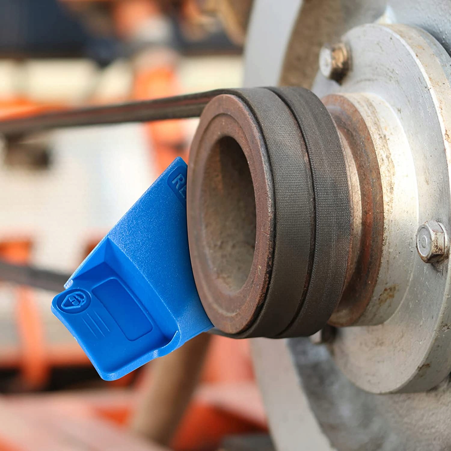 Надевание одного устройства на шкив во время вращения колеса приводит к соскальзыванию натянутого ремня, второе устройство заставляет ремень скользить по колесу во время вращения колеса.
