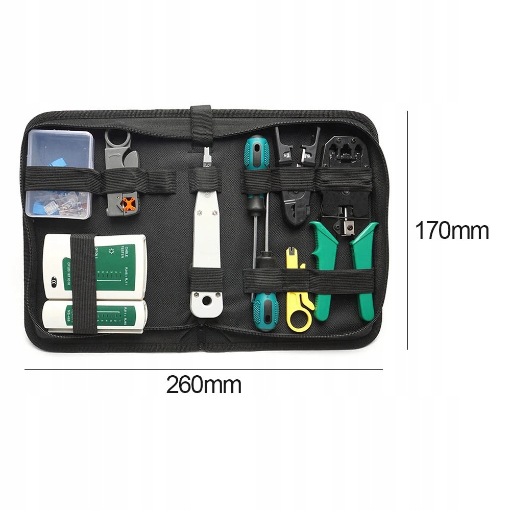 Набор сетевых инструментов бережно помещен в удобный кейс, позволяющий хранить все необходимые инструменты в одном месте. Чемодан функционирует как практичный органайзер: каждый инструмент имеет свое собственное место, что позволяет быстро найти его при необходимости. Кроме того, чехол обеспечивает эффективную защиту от внешних факторов, таких как дождь, грязь, падения и вибрация. Он также оснащен удобным ремешком на руку, поэтому его можно легко носить с собой и всегда иметь под рукой.