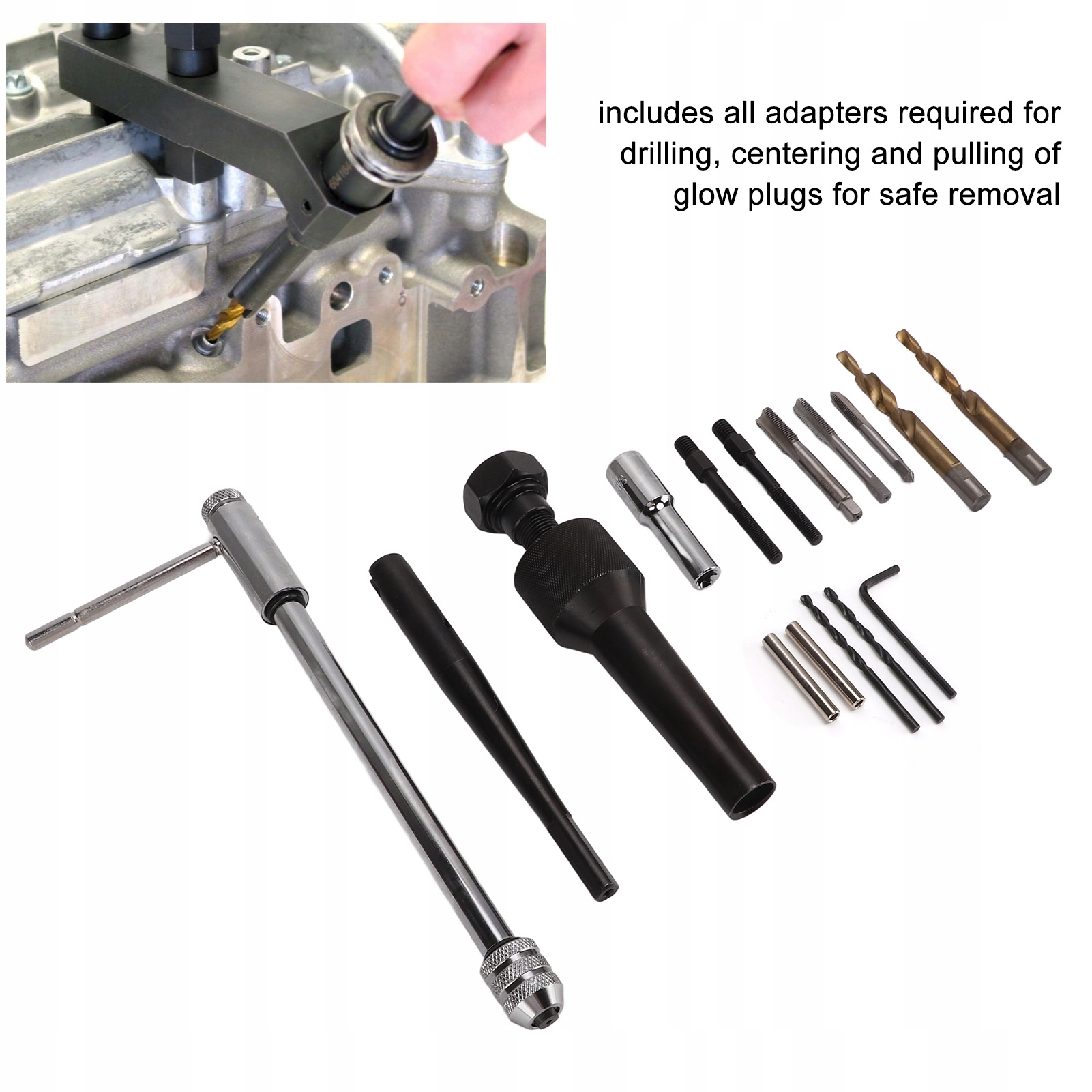 3. В комплект поставки входят: В комплект инструментов для ремонта свечей накаливания входят все адаптеры, необходимые для сверления, центрирования и вытягивания свечей накаливания для безопасного снятия и надежности в использовании.