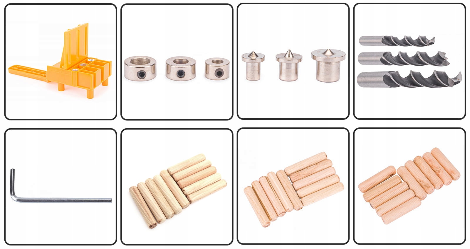 Устройство, предназначенное для выполнения отверстий для угловых соединений типов "Т" и "Е" и "Л" с использованием штифтов 6, 8 или 10 мм в дереве и ДСП толщиной до 30 мм.