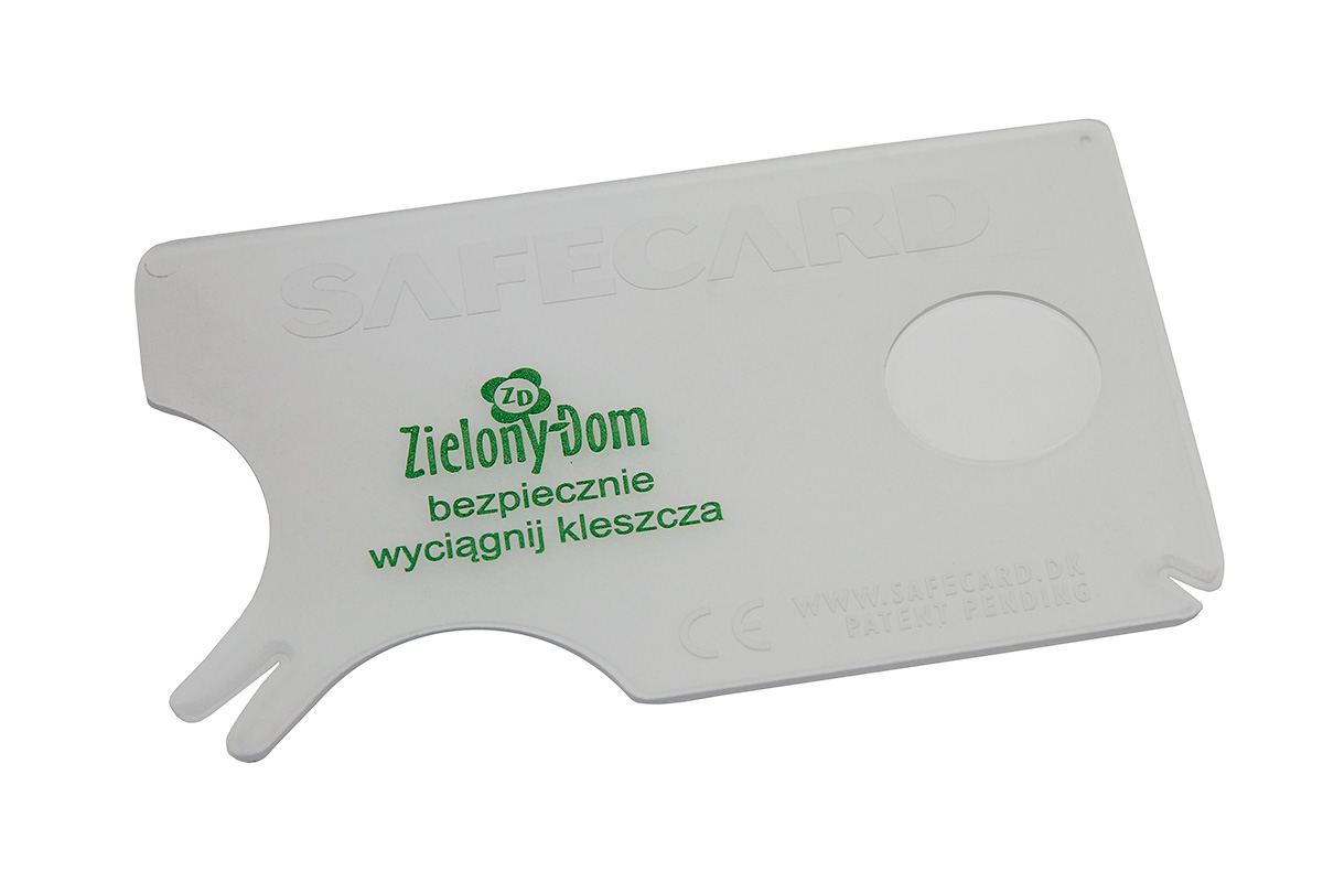 TICK REMOVER SafeCard создан в результате сотрудничества ученых, биологов и врачей, специализирующихся на заболеваниях, вызванных укусами клещей. Форма карты позволяет использовать ее на всем теле. SafeCard также очень помогает удалить жало после укуса пчелы (меньший вырез на карте).