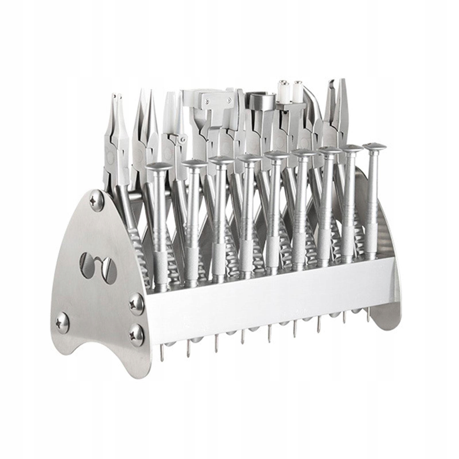 [Универсальность и совместимость]: Эта подставка для инструментов для ремонта часовых стекол универсальна и предназначена для размещения широкого спектра инструментов для ремонта часов и очков. Органайзер имеет 9 небольших отверстий и полочку для хранения плоскогубцев.