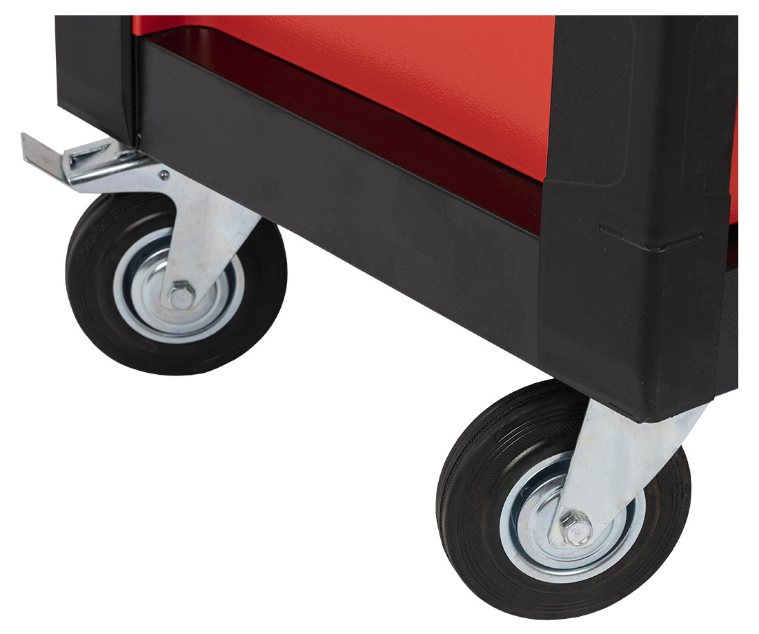Эта тележка для инструментов имеет большие прочные колеса. Благодаря этому вы легко сможете переместить его в любое место мастерской. Дополнительно одно из колес имеет тормоз – благодаря этому вы легко сможете разместить его в выбранном месте мастерской.