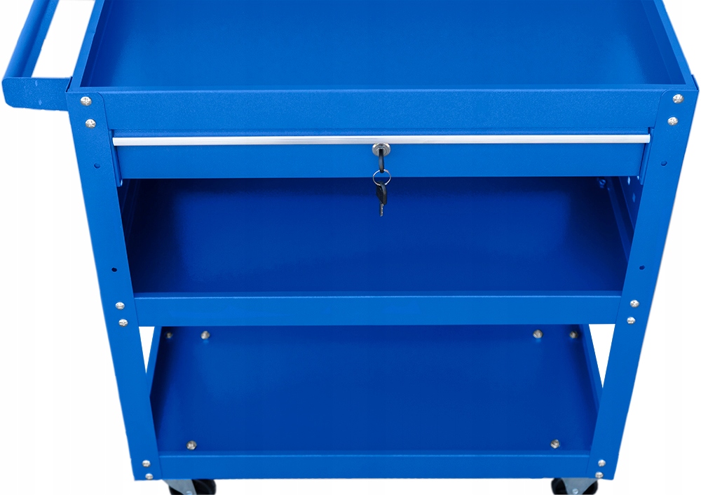 - Дополнительные функции: Профессиональная тележка для мастерской включает в себя запираемый ящик, установленный на шарикоподшипниках, и 2 полки, обеспечивающие дополнительное место для инструментов и материалов.