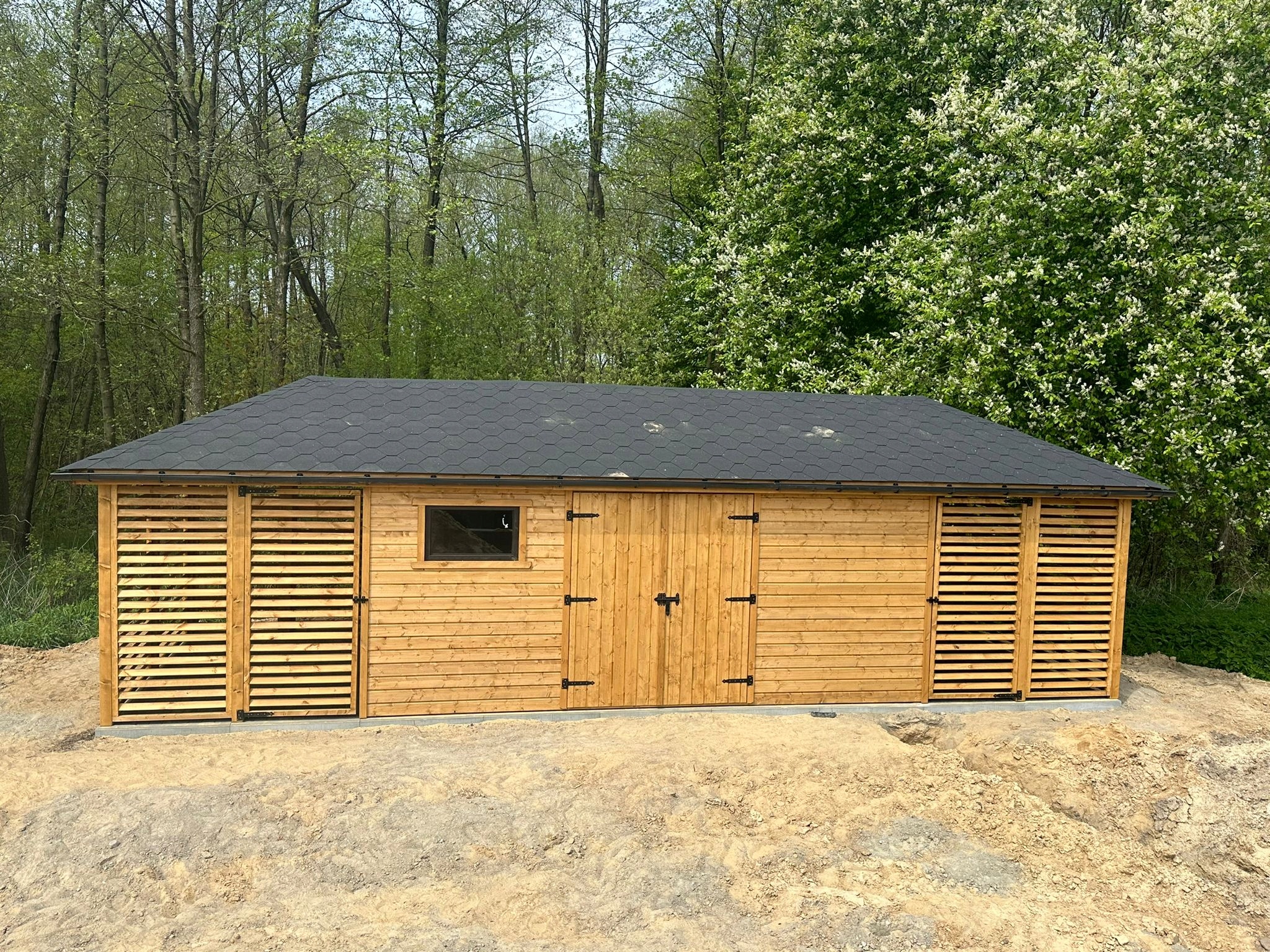 Спасибо за интерес к нашей компании. Предлагаем инструментальный домик с дровяным сараем размерами - Подсобное помещение 3м х 5м + дровяной сарай 3м х 2м из ели (без пола). Крыша изготовлена из бруса 9см х 4см, обшита обшивкой (метод «шип-паз») и покрыта битумной черепицей. Все деревянные элементы тщательно шлифуются и фрезеруются. Заботясь о наших клиентах, мы предлагаем древесину камерной сушки. Дом дважды покрашен пропиткой марки DREWNOCHRON.