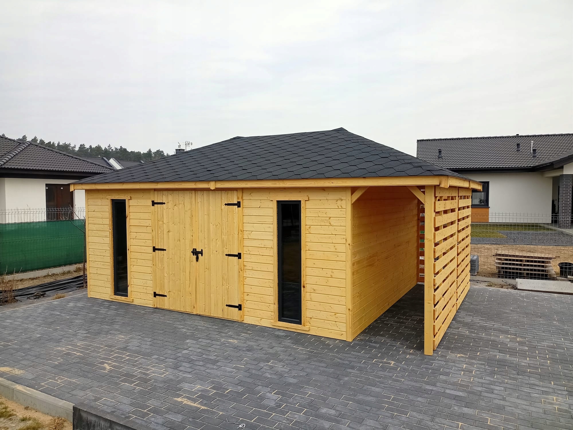 Спасибо за интерес к нашей компании. Предлагаем инструментальный домик с дровяным сараем размерами - Подсобное помещение 4м х 5м + дровяной сарай 4м х 1м из соснового бруса (без пола). Крыша изготовлена из бруса 8см х 4см, обшита обшивкой (методом «шип-паз») и покрыта битумной черепицей. Все деревянные элементы тщательно шлифуются и фрезеруются. Заботясь о наших клиентах, мы предлагаем древесину камерной сушки. Дом дважды покрашен пропиткой марки DREWNOCHRON.