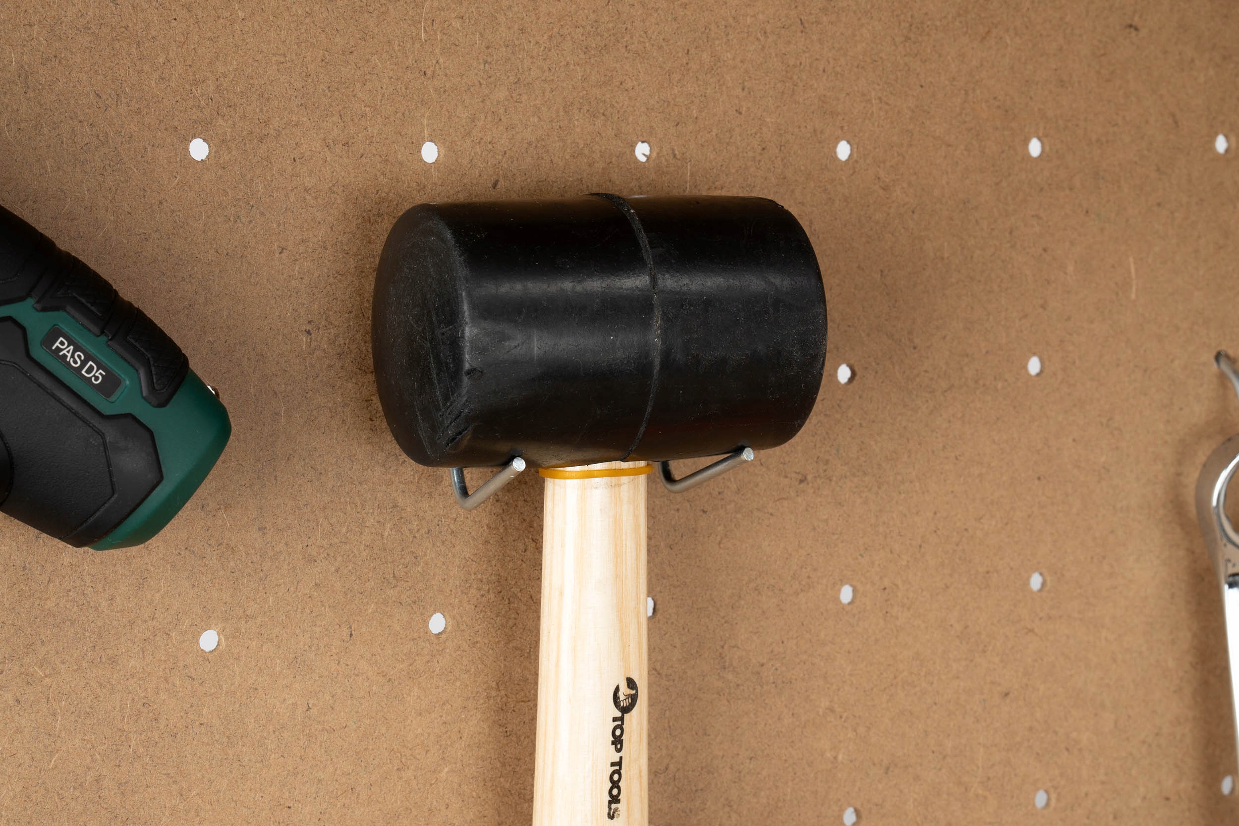 Нижняя и верхняя полки, а также дополнительная перфорированная доска для инструментов с 20 крючками позволяют любую расстановку и поддержание порядка в мастерской. Максимальная нагрузка на доску — 20 кг.