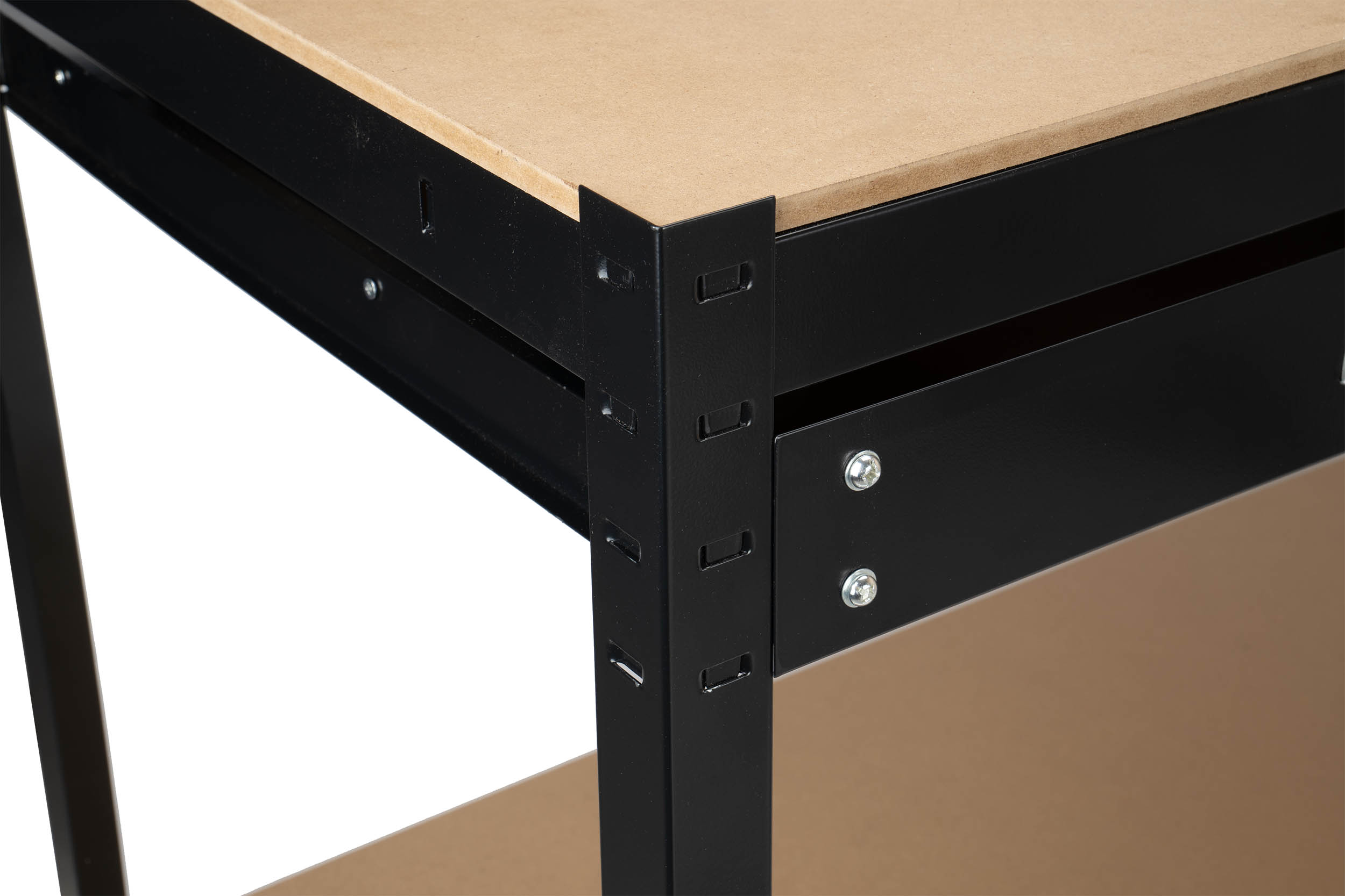 Стол оснащен толстыми плитами МДФ, что гарантирует устойчивость и долговечность при выполнении различных работ. Благодаря прочным материалам стол устойчив к повреждениям и обеспечивает длительное использование. Толстые плиты МДФ поддерживают как столешницу, так и полки, что еще больше повышает долговечность всей конструкции.