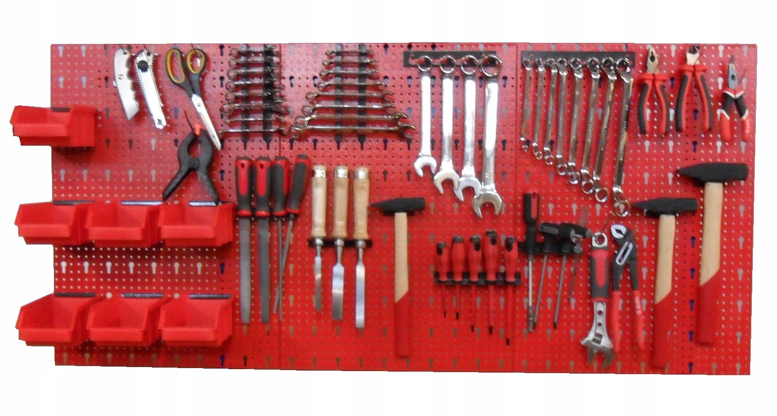• 30 подвесок, в том числе: 14 деталей из листового металла для рожковых ключей, молотков, напильников, долот, отверток, малых и больших накидных ключей, сверл, 9 частей проволоки: 3 длинных (110 мм, фи 4 мм), 3 средних (90 мм, диаметр 3 мм), 3 коротких (70 мм, диаметр 3 мм)