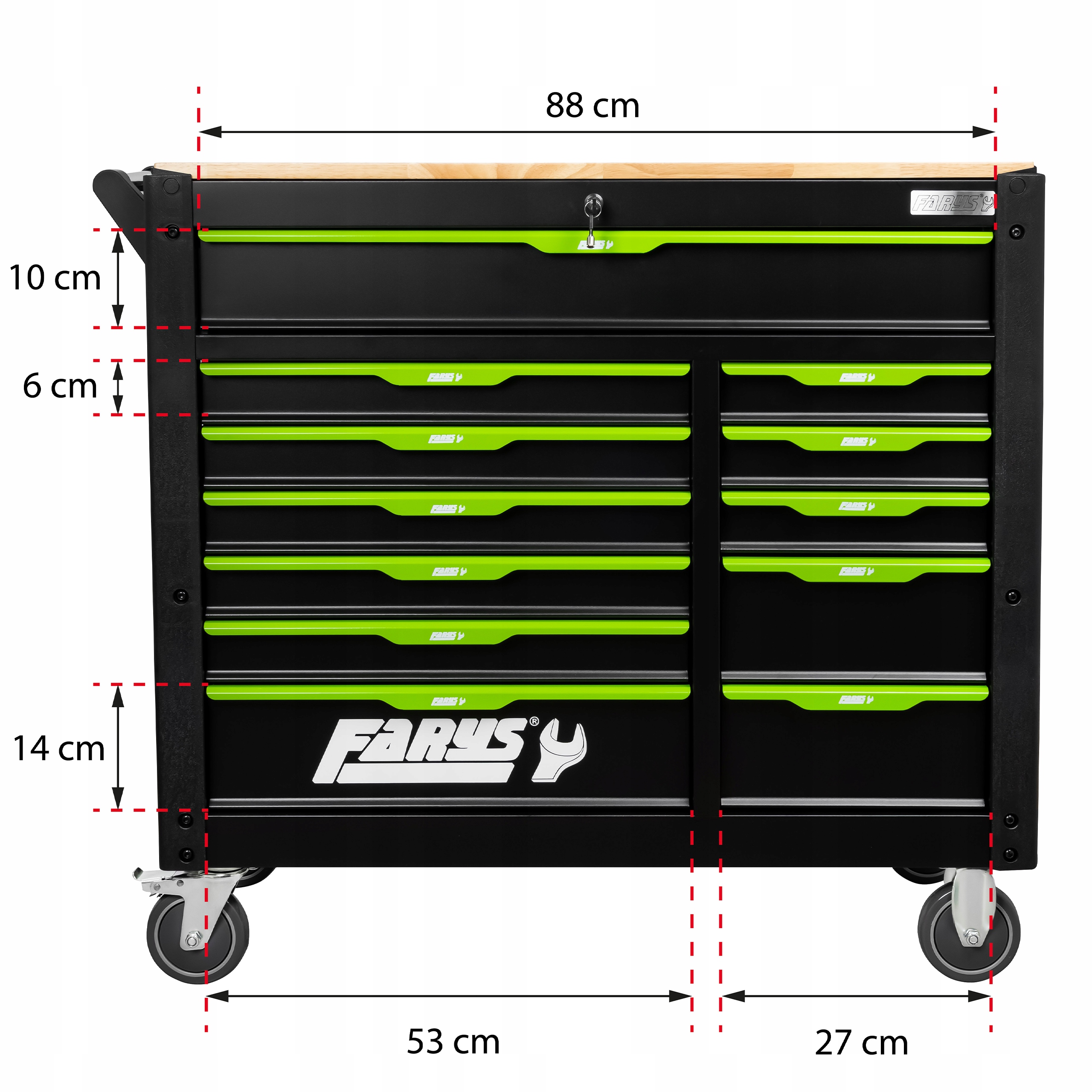 Мы представляем идеальное решение для профессионалов и DIY - панель инструментов с элегантной черной отделкой с интенсивными зелеными акцентами, которые придадут вашему семинару современный и профессиональный вид. Эта коляска предлагает много места для хранения, 12 вместительных ящиков с глубиной 40 см. Тело изготовлено из листа толщиной 1 мм и ящики листовых металлов толщиной 0,8 мм, обеспечивающие долговечность в течение многих лет. Коляска оснащена деревянной столешницей и эргономической ручкой, которая может быть установлена с обеих сторон, что обеспечивает максимальное удобство использования.
