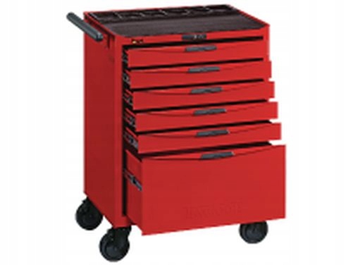 Изготовлен из красного стального листа. С двумя фиксированными колесами и двумя (с тормозом) поворотными. Оснащен 6 ящиками на шарикоподшипниках с кодовым замком. Дно каждого ящика покрыто губкой. Прочная ручка для буксировки коляски. Столешница с ковриком из АБС-пластика, с отделениями. Размеры ящика (1 шт.) 576х380х312 мм. Размеры ящика (5 шт.) 576х380х75 мм.
